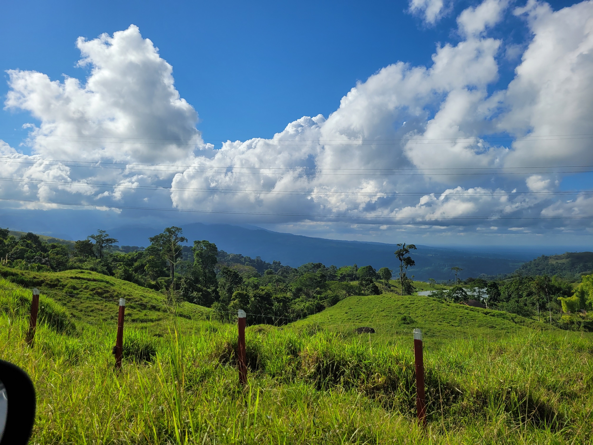 Natürlich war die Nacht trotz großer Müdigkeit nicht ganz so ruhig. Wir mussten eh um 5:30h raus. Während wir mit unserer Frühstücksbox auf dem Schoß auf den Bus gewartet haben konnten wir den fremden Klängen lauschen und die milde Luft genießen. Der Bus war pünktlich und nach mehreren Stopps zum aufladen der anderen Gäste ging es auf den Highway Richtung Osten. Der Weg führte uns durch den Nebelwald des Braulio Carrillo NPs. San Jose liegt auf ca. 1000 m, die Passhöhe der Straße im NP liegt auf 1600 m, danach ging es runter zur Karibikseite. Die Landschaft wird flach und ist durch Viehzucht, Rinder und Wasserbüffel, bestimmt.