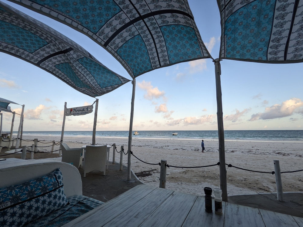Heute war etwas mehr los. Um 6:30h sind wir zu einem Strandspaziergang Richtung Tansania aufgebrochen, 3km weit sind wir gekommen, zurück waren wir dann bei sechs Kilometern. Natürlich gabs vor dem Frühstück noch eine Abkühlungen Meer. Leiderf ist b ei der Barfußlauferei am Strand meine Blase, die ich mir beim ersten Strandspaziergang zugezogen habe größer geworden, blöd. Den Rest des Tages haben wir wie den Vortag verbracht. Zum Abschluss sind wir natürlich noch mal ins Meer gesprungen. Zum Abschied gönnen wir uns noch mal ein Abendessen auswärts statt der Hotelkantine. Ich hab mich kein Mal auf das Essen dort gefreut, daher noch Mal ins Nomad. Das Essen war köstlich und das ganze bildete den perfekten Rahmen für den Abschluss unserer Reise. Hakuna Matata!