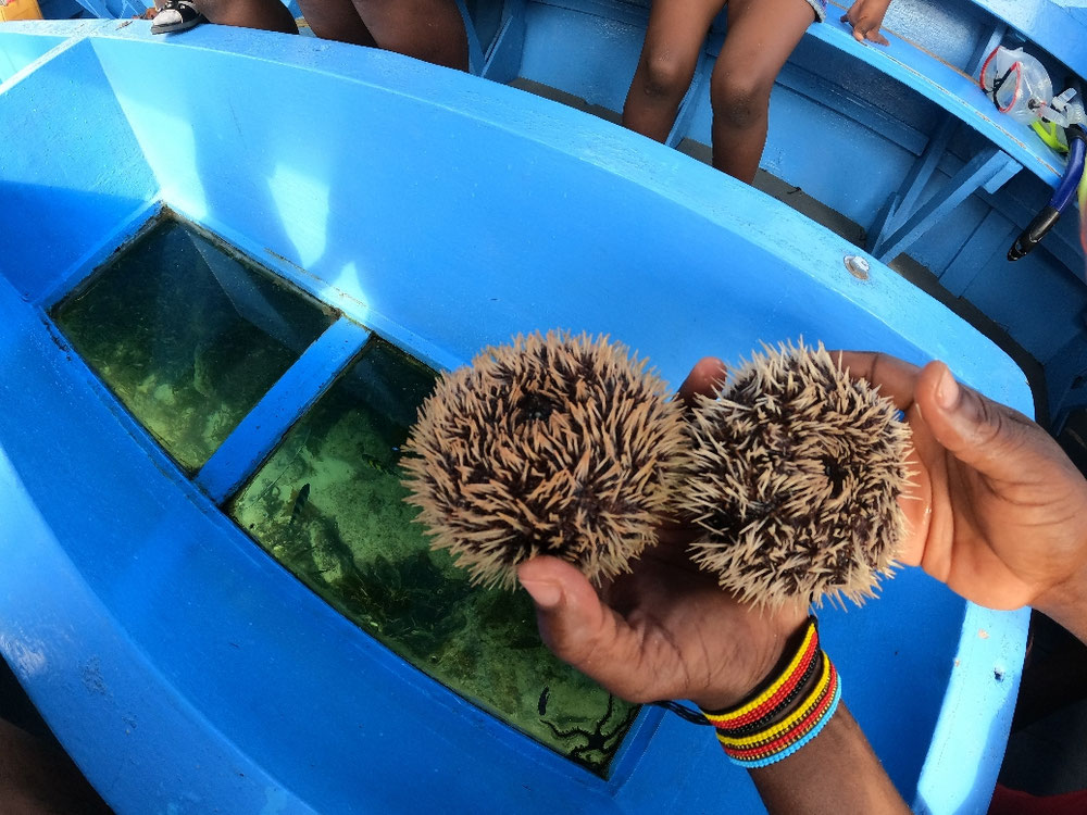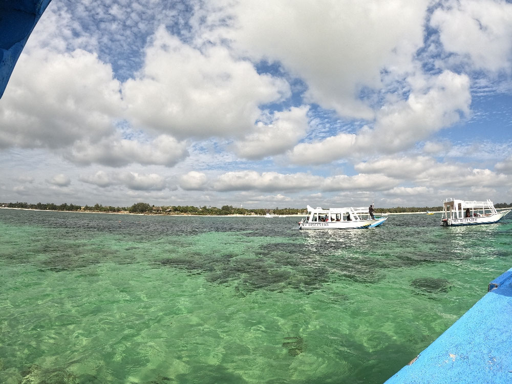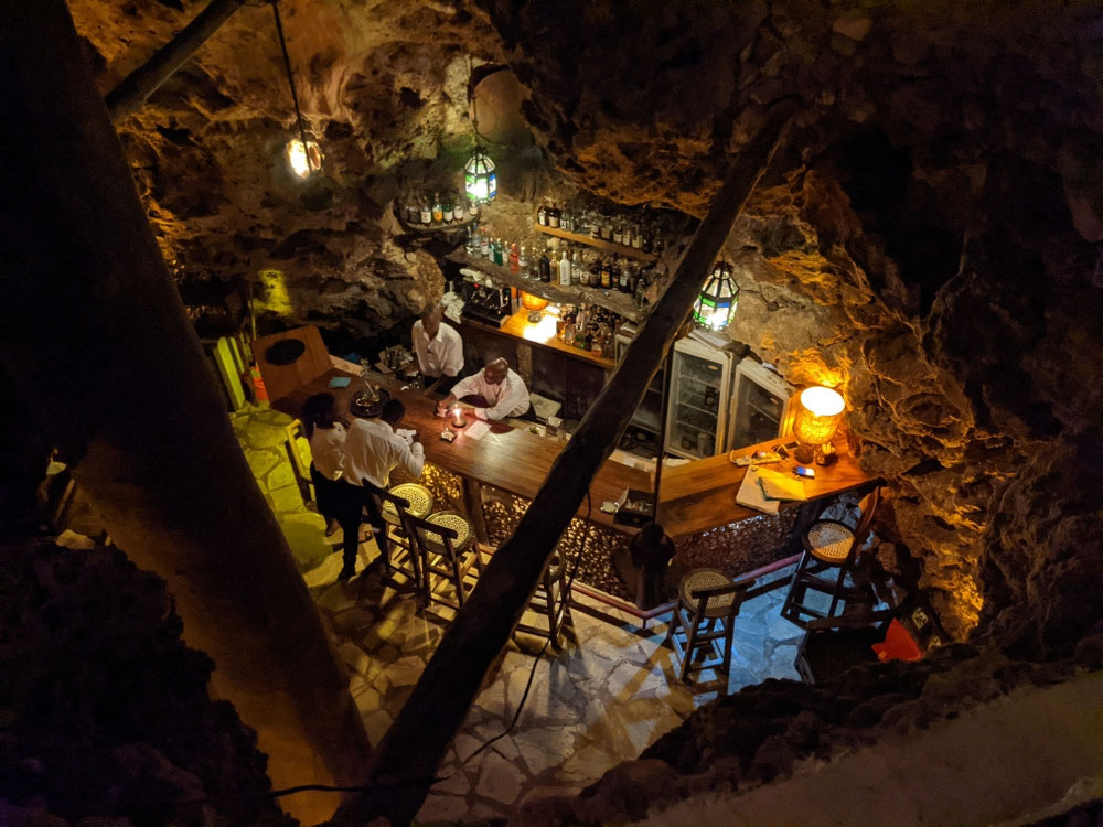 Heute standen gleich zwei Diani Beach Highlights auf dem Programm. Zunächst sind wir um 9:00h mit Ali und der MV Kongo zur vorgelagerten Sandbank zum schnorcheln gefahren. Wir haben allerlei kleine Fische, Muränen, Seesterne, Würmer und anderes Getier gesehen. Dazu noch Korallen, die waren zwar farblich nichts besonders aber immerhin lebendiger als auf den Seychellen. Danach macht Ali mit uns noch eine Runde über die Sandbank wo es noch Muscheln zu sehen gibt. Im Anschluss sehen wir uns noch an, wie die kenianischen Nichtschwimmer sich im Wasser bewegen und nach zwei Stunden mit der auflaufenden Flut geht es auch schon wieder zurück zum Strand. Für 20 Eur war das ein guter Ausflug. Danach geht es bis zum späten Nachmittag an den Pool weil um 17:30h wurden wir schon wieder abgeholt. Wir haben einen Tisch im Ali Barbour Cave Restaurant gebucht. Eine tolle Location in einer nach oben offenen Höhle wie eine Cenote in Mexico. Das war nach der Kantine im Hotel ein toller Abend in gepflegtem Ambiente. Nach einem Cocktail an der Bar lassen wir uns vom Fahrer zurück zum Hotel bringen und fallen uns Bett. Pole Pole!
