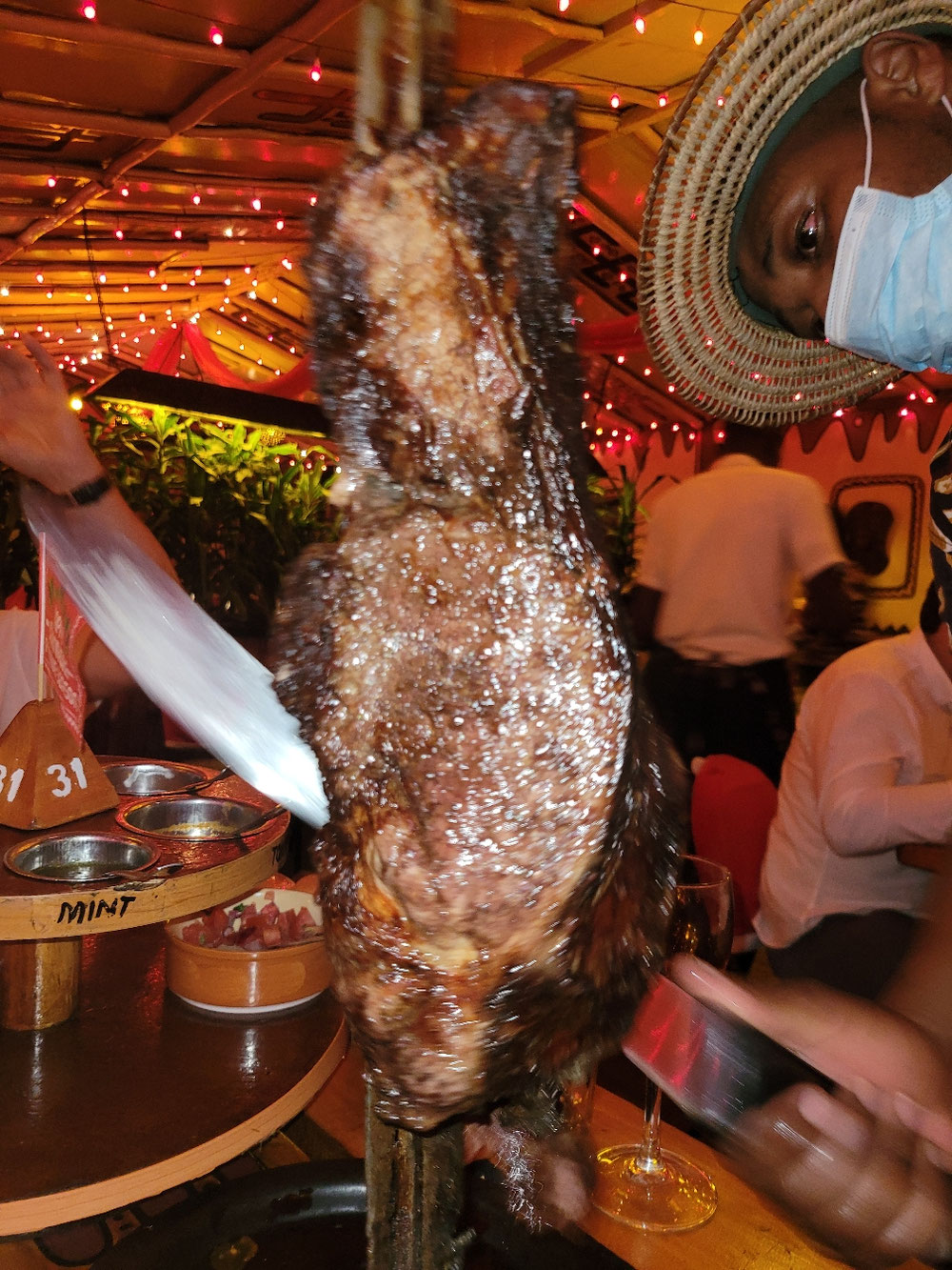 Heute geht’s nur ums Fahren und Essen. Geplante Abfahrtszeit ist um 7:30h, das klappt auch so weit. Zügig steuert Thomas durch den Park, damit nur ja niemand mehr etwas sieht was fotografiert werden muss. Aber, wir sehen noch einmal eine Herde Elefanten, dafür stoppt Thomas dann. Gegen 10:30h sind wir bereits in Arusha in der Kaffee-Lodge. Die liegt tatsächlich bei einer Kaffeplantage. Hier werden wir nochmals aufgeteilt. Der Holzfäller mit Frau bleibt den Tag über in der Kaffee-Lodge, deren Flug nach Sansibar geht erst um 20:00h. Die Haweianer werden gleich zum Flughafen Kilimanjaro gebracht und für uns geht es wieder zum Lunch in Sheraton 4 Points. Dort hat Eva letzte Woche einen bleibenden Eindruck hinterlassen und wird von allem möglichen Personal namentlich begrüßt. Ab dann wird es ziemlich langweilig, mit Thomas in einem Toyota 8-Sitzer zurück zum Grenzübergang Namanga. Der Grenzübertritt geht heute recht zügig, es ist erheblich weniger los als beim letzten Mal. Auf der anderen Seite wartet bereits Phillip von Pollmanns auf uns. Er bringt uns noch den langen Weg bis Nairobi. Neben der Hotel führt die Autobahn vorbei und dahinter liegt bereits der Nairobi NP, was sehen wir dort von der Autobahn aus, zwei Nashörner, unglaublich, das was in Tanzania einfach nicht gelingen wollte sehen wir mal eben im vorbeifahren von der Autobahn aus, das ist halt der Unterschied – Kenia kann ein wenig mehr. Irgendwann eröffnet Phillip uns, dass wir heute noch zum Dinner ins Carnivore Restaurant müssen. Eigentlich hatten wir uns beide auf ein leichtes Essen im Hotel gefreut. Stattdessen geht es in die Churasceria auf kenianisch. Ein cooler Laden, leider haben wir wenig Zeit, keinen Hunger und kommen dort abgerissen von einem langen Tag an. Die Leute sind extrem nett, wir probieren uns durch und Eva probiert sogar die besondere Spezialität des Tages, Bullentestikel. Ich hab verweigert. Da wir beide nicht mehr können brechen wir vor dem Dessert ab und lassen uns von Phillip ins Hotel bringen. Page Alex begleitet uns zum Zimmer und macht noch einige Späßchen. Die Leute in Kenia sind einach lässiger – Hakuna Matata.