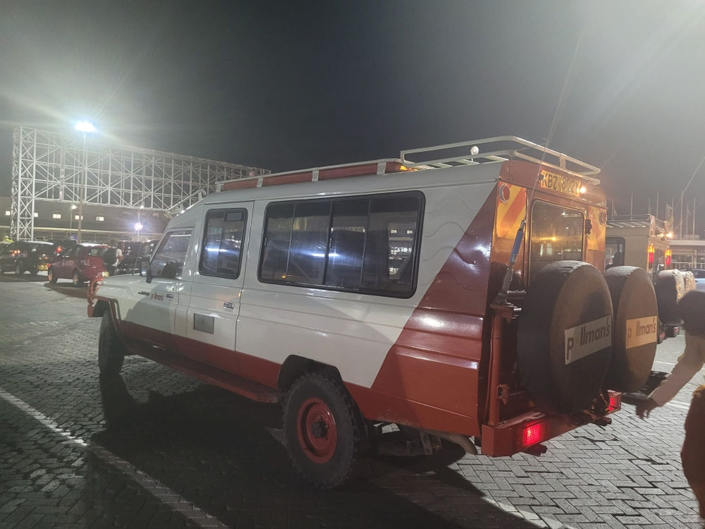 Unsere Flugzeit war ca. 7,5h plus 2h Zeitverschiebung. Heute hat die Lufthansa beim Service etwas Boden gut gemacht, wir konnten aus zwei Gerichten auswählen und es gab bis zum Ende Wein. Nach dem Anflug über ziemlich dunkles Land gabs eine sanfte Landung. Zur Einreise mussten wir durch Impfkontrolle, Passkontrolle und Handgepäckkontrolle. Schliesslich wurden wir von einem Mitarbeiter der lokalen Agentur in Empfang genommen, Fahrer Tom hat uns mit dem Safarifahrzeug in ca. 15min bis zum Hotel gefahren. Da die Tour Morgen bereits um 7:00nh startet ist jetzt Feierabend! Hakuna Matata!
