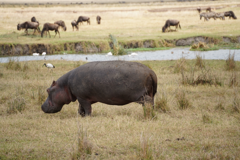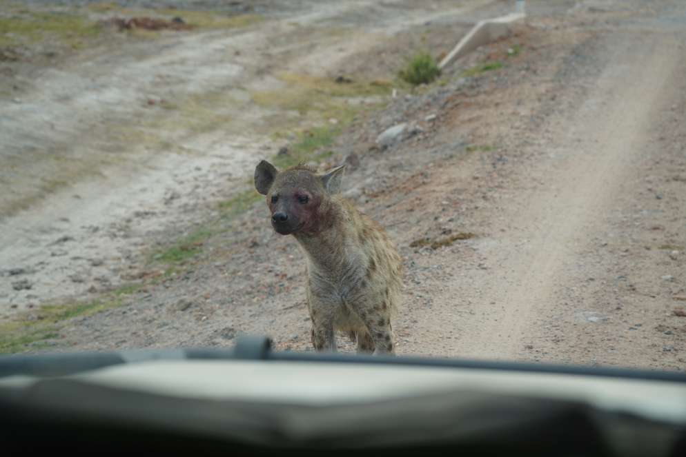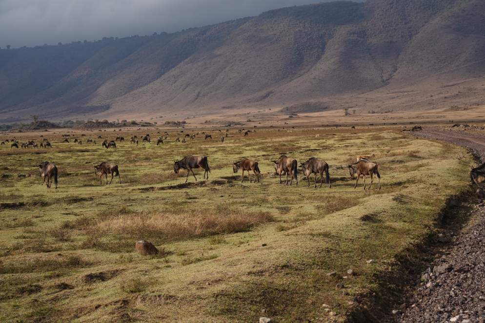 Nach einem kurzen Frühstück starten wir heute um 7:00h um den Ngorongoro Krater zu erkunden. Es geht über eine extrem steile, gepflasterte Straße ca. 20min die 700m in den Krater herunter. Unten angekommen eröffnet sich die eigentliche Größe des Kraters, der Durchmesser liegt zwischen 19-21km. Sieht vom Balkon im Hotel gar nicht so groß aus. Der Gamedrive heute ist ein wenig mau, natürlich sind alle Tiere vorhanden, ab was wir eigentlich sehen wollen ist das schwarze Nashorn oder Spitzmaulnashorn. Thomas der Fahrer findet auch eins, aber so weit weg, dass man so gerade das Horn erkennen kann. Wirklich ein kleiner Punkt in der Landschaft. So wird es auch den ganzen Tag über bleiben. Wir sehen zwar noch mal zwei oder wahrscheinlich die gleichen wieder aber ebenfalls aus maximaler Entfernung.  Am Picknickplatz mache ich eine Erfahrung mit einem schwarzen Milan, der klaut mir mein Muffin, war eh ziemlich trocken Thomas hatte uns davor gewarnt, ich wollte aber nicht auch noch in der Pause im Auto sitzen. Ich hatte meine Erfahrung mit dem Milan, die anderen hatten ihren Spaß. Nachmittags fing es dann auch noch an zu regnen, Rhinos haben sich eh keine gezeigt, also sind wir die andere Einbahnstraße, diesmal die für den Aufstieg wieder hoch. Kurz vor Ende gab es noch einen kleinen Stau, ein Auto hatte schlapp gemacht und wurde vom nachfolgenden Landcruiser einfach hoch geschoben. Da es regnet lassen wir die Krater Walkingtour vom Hotel ausfallen, ruhen uns ein wenig aus und genießen mit den mitreisenden das Abendprogramm vom Hotel dann noch Abendessen, das war es für heute – Hakuna Matata!