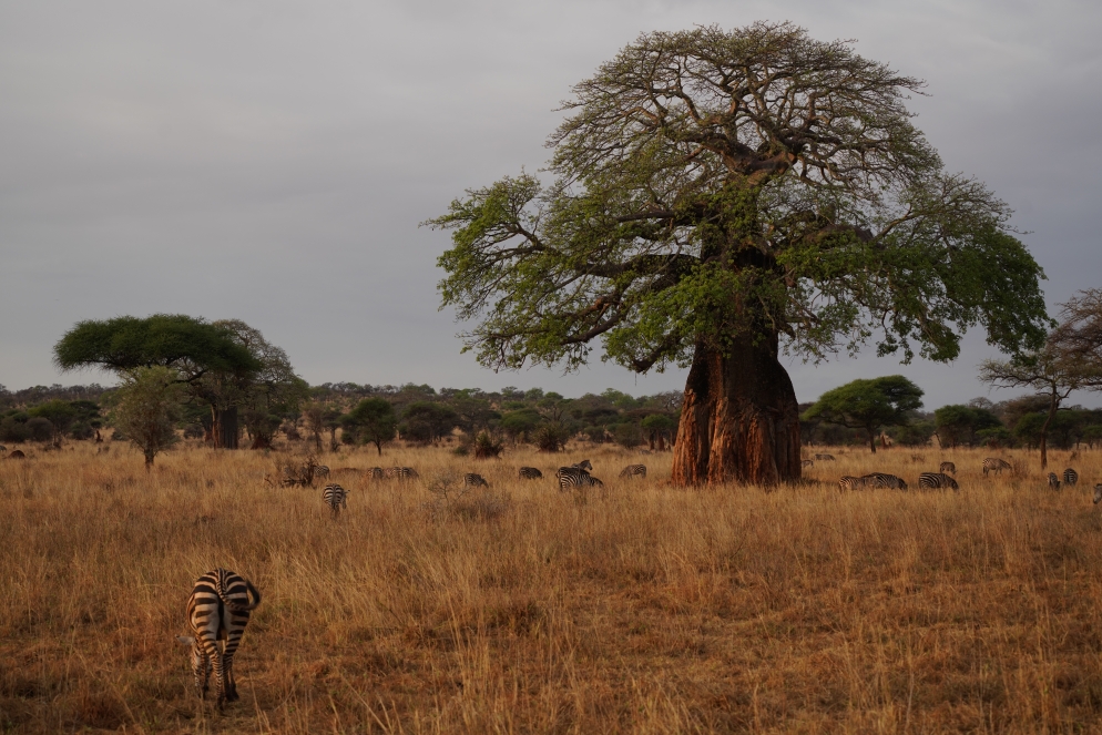 Der Tag beginnt mit einem wunderschönen Sonnenaufgang den wir aus dem Bett mit Sicht über den Krater verfolgen können und so viel kann ich vorweg nehmen, er wird an anderer Stelle auch ebenso enden. Start ist heute zu einer christlichen Zeit nämlich um 8:00h, wir nehmen uns alle Zeit um mit Ruhe zu packen und zu frühstücken. Erst führt uns die Strecke ein Stück am Kraterrand entlang um dann den Abstieg von 2400m auch ca. 1700m zum Gate zu beginnen. Von dort gibt es endlich wieder asphaltierte Straße, vorbei am Lake Manyara Park und dann endlich Richtung Tarangire NP. Ab dem Gate wird das Safaridach hoch geklappt und der Gamedrive beginnt. Hier auf 1000m ist es angenehm warm, während wir am Ngorongoro doch hier und da gefroren haben. Dafür haben wir es jetzt mit CC-Fliegen zu tun, die nicht nur stechen sondern auch noch die Schlafkrankheit übertragen. Unser lokales Insektenzeug hilft hier gar nicht und ich werde etliche Male gestochen, hoffentlich nicht infiziert. Auch wenn das eine oder andere Hotel sehr an Phantasialand oder Hobbitbauten erinnerte, so ist dieses von außen doch Recht lieblos gestaltet, einfacher Zementputz an den Wänden und alles sei den Achtzigern nicht mehr verändert. Der Gamedrive ab 15:30h bietet eigentlich nur zwei Highlights, die Elefanten und die Baobab Bäume, beide bekommen wir in Hülle und Fülle. Außerdem noch die üblichen verdächtigen und jede Menge Vögel – in Ermangelung von Großwild. Dafür gibt es am Ende n och einen tollen Sonnenuntergang.