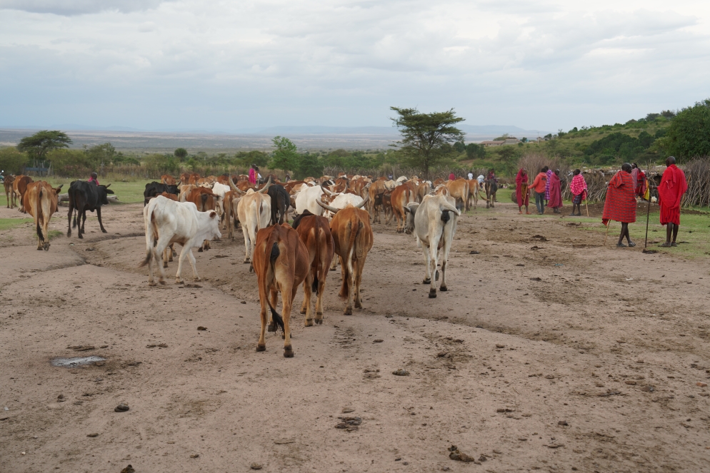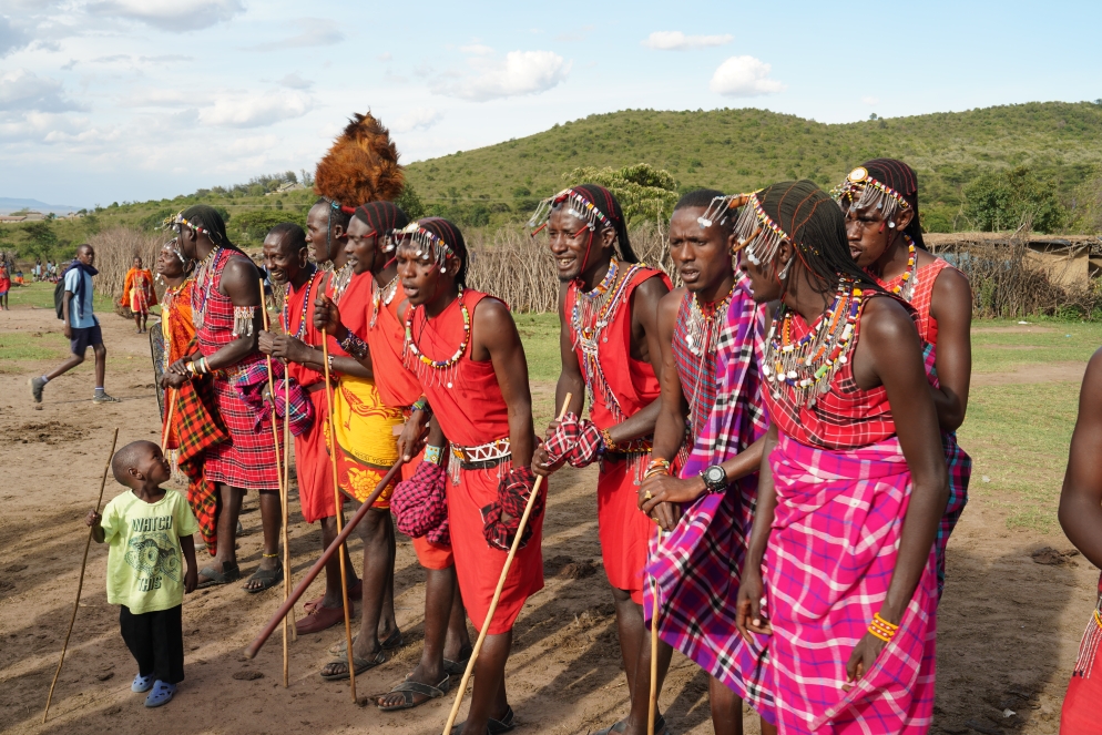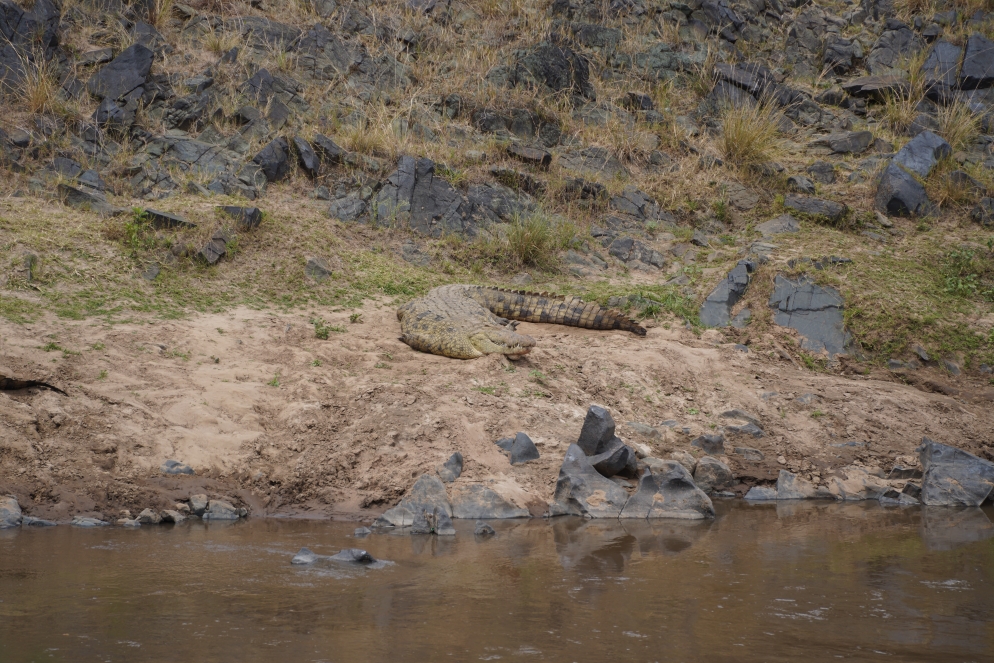 Aufstehen um 6:00h, Frühstück, kurzer Check am Hippopond und dann ist es auch schon 7:30h und Zeit für unsere erste Exkursion. Wir sehen Marabus, und allerlei Antilopen, Büffel und was sonst noch, diesmal alles bei gutem Licht und es gelingen super Aufnahmen. Alles soweit recht unspektakulär. Bis wir bei einem Löwenpaar vorbei kommen. Beide sehen sehr entspannt aus und schlafen im Graß im Schatten eines Busch. Irgendwann werden die beiden munter und das Weibchen fängt an sich herum zu rollen. Just in dem Moment teilt ein anderer Guide Abdi mit, dass wir einen platten Reifen haben. Verständlicher Weise lässt ihm das keine Ruhe, er fährt auf plattem Reifen ca. 100m  von den Löwen weg und fängt an den Reifen zu wechseln. Guide David von einem anderen Auto hilft ihm dabei. Leider passiert genau in dem Augenblick dass, worauf wir die ganze Zeit gewartet hatten, das sich Löwe und Löwin vereinen. Wir können dem Akt folgen, aber statt aus 5m Entfernung aus 100m. Irgendwann ist der Reifen gewechselt, wir fahren zurück zu den beiden Löwen, die inzwischen wieder entspannt sind und warten was passiert. Es dauerte nicht lange und das Liebespiel der Löwen wiederholte sich. Auf dem Weg zum Mara River gibt es eine Kaffee Pause unter einem Baum mit toller Rundumsicht zu der uns David einlädt. Danach noch ein Stopp am Lookoutpunkt und dann endlich zum Mara River, dort wo die Krokodile in den Dokumentationen auf die Gnus warten die auf die andere Seite wollen. Da die Migration seit einigen Wochen durch ist, ist heute Ruhe am Fluss, die Hippos dösen im Wasser und auf Sandbänken und die Krokodile sonnen sich. Ein wenig Aufregung gibt es noch weil sich ein Gepard in der Uferböschung aufhalten soll, wir sehen aber nichts. Der Abschluss der Morgentour war der Besuch der Grenze zu Tanzania. Auf der einen Seite Serengeti, auf der anderen Masai Mara. Mal sehen ob wir in einer Woche den Grenzstein von der anderen Seite besuchen kommen. Zurück im Hotel gabs Lunch und zwei Stunden Pause. Die zweite Exkursion ab 16:00h führte uns ins Massai Dorf, grobe Hütten aus Ästen und mit Kuhdung zugeschmiert. Die leben tatsächlich dort. Aber erst mal gibt es einen Gesangsvortrag von den Männern und dann von den Frauen. Einer der Jungs führt uns rund und erklärt. Die Masai sind gross und schlank weil sie Blut mit Kuhmilch trinken und 60km am Tag laufen. Man zeigt uns wie man Feuer macht, das geht echt fix, mit zwei verschiedenen Stücken Holz die aneinander gerieben werden. Dann steht der Besuch eines Hauses an, gleich neben dem Eingang ist der Hühnerstall. Der zentrale Raum hat eine kleine Feuerstelle und so was wie ein Regal, davon gehen drei Schlafkojen ab das Elternschlafzimmer, die Liegefläche für die drei Mädchen und das Bett für den Sohn. Alles dunkel und ungemütlich. Auf dem zentralen Platz des Dorfes werden nachts die Kühe gehalten, dementsprechend vollgeschissen sieht es dort aus, man muss echt aufpassen wo man hin tritt. Nun, für 10 Kühe gibt es eine Frau, da muss so ein Dorf einiges an Kühen vorhalten. Nach der Besichtigung müssen wir noch über den Markt, jeder bekommt einen Guide zugewiesen der auf die einzelnen Produkte aufmerksam macht, er lässt auch nicht locker bis wir wirklich alle Stände inspiziert und was gekauft haben. Die letzte Verkaufsveranstaltung ist ein Besuch beim Schmied der uns zeigt was er alles kalt verformen kann, eine Kunst die seit Generation vom Vater auf den Sohn weitergegeben wird. Zum Ende sehen wir noch die Rückkehr der Rinder von der Weide. Nach dem Besuch sind die Füsse mit einer Schicht Kuhdungstaub bedeckt. Auf der Rückfahrt sehen wir noch Elefanten gleich neben der Strasse und am Hotel dürfen wir noch einen tollen Sonnenuntergang erleben. So war das heute – Hakuna Matata