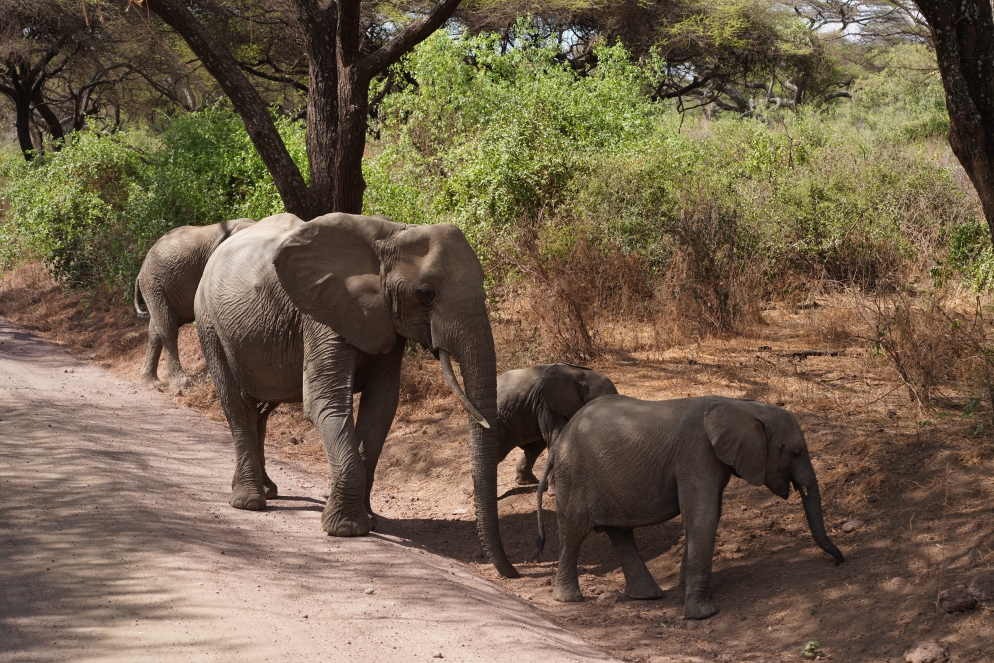 Das war ein langer Tag. Los ging es heute schon um 7:00h zum Game Drive im Manyara NP. Der Park ist ziemlich klein, für hiesige Verhältnisse, trotzdem war die Rückfahrt vom Ende des NP zum  Gate über 10km lang. Los ging es mit Affen und Hornvögeln, dann direkt ein Leopard, leider sehe ich ihn zu spät und daher gibt es nur ein Bild von der Hinteransicht als er sich uns Dickicht verdrückt. Lake Manyara ist ganz anders als die bisherigen Parks, sehr viele Bäume, daher sind die Tiere nur schwer aus zu machen. Was wir zu hauf sehen sind Elefanten, richtige Kolosse und ich mache die bisher besten Elefantenbilder. Nach der Parkbesichtigung geht es in die Verkaufsstelle für Tanzanit, einen blauen Edelstein der hier abgebaut wird. Hauptsächlich geht es aber darum unsere Lunchboxen zu verzehren. Danach geht es auf den langen Weg nach Serengeti, der uns auch durch den Ngorgoro NP führt. Da es gut geregnet hat, ist die unbefestigte Strasse rutschig wie auf Schmierseife. Das zweite Auto unserer Truppe fährt sich fest und eine Tragödie zur wieder Mobilmachung kommt in Gang. Es werden viel Kommandos von allen möglichen Leuten gegeben. Wobei man feststellen muss, dass unsere beiden Guides zwar Wortführer sind, aber sich selbst nicht schmutzig machen. So geht es weiter, immer mal wieder muss ein Auto flott gemacht werden. Meist dadurch, dass der nasse Strassenbelag abgeschaufelt wird. So brauchen wir für 2km 2 Stunden. Danach bleibt natürlich keine Zeit mehr für Fotostopps und Pinkelpausen, es geht nur noch mit Vollgas über die Waschbrett Pisten. Teilweise mit bis zu 100km/h, verrückt wie die Autos das aushalten die diese Tortur wöchentlich bekommen. Die Landschaft wechselt wieder, das Gras wird gelb und das Land flach. Im Serengeti Park sind 50km/h erlaubt, aber es geht einfach weiter. Schließlich waren wir um 20:15 in der Lodge, die hat wieder was von Wutztown im Phantasialand. Abendessen und danch war es auch schon Zeit ins Bett zu gehen. This was really Africa!