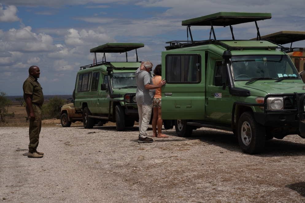 Um 6:15h satt um 6:00h und als Geste guten Willens an die australischen Ladies, ging es los mit unserem Game Ride. Direkt am Hotel gibt es einige Vögel und natürlich Affen zu bestaunen. Inzwischen sind wir einigermaßen gesättigt, die Erwartungen werden immer grösser und befriedigt. Wir sehen eine Hyänen Familie, einen Löwen beim essen und beim sich anschließenden Flirt und einen richtig fetten Löwen. Interessant sind auch die Dispute die unser Fahrer Abdil mit seinem jüngeren Kollegen hat. Weiter geht es zu dem Bereich des Parks wo die Elefanten sich aufhalten und auch dort werden alle Erwartungen erfüllt, einige Erwachsene- und Jungtiere. Auf dem Rückweg zum Hotel gab es dann noch Schakale und den ugandischen Nationalkranich. Bis um 16:00h Gamedrive brauchen wir lediglich zu frühstücken, herum zu gammeln, Mittag zu essen und wieder rum zu gammeln. Zur 16:00h Tour sehen wir nicht viele Tiere und die nur aus der Entfernung, 7 Löwen die sich ein Zebra teilen, Hippos beim grasen, Elefanten im Wasser und an Land. Toll ist der Blick über den Park vom Lookout Punkt, den jedoch nur Eva und ich erklimmen. Schließlich zeigt sich noch die Spitze des Kilimanjaro und es gibt auch noch das Bild mit dem obligatorischen Elefanten davor. Zum Abschluss noch der Sonnenuntergang im Park und dann war das schon die letzte Pirschfahrt in Kenia. Zum Abendessen sitzen wir noch mal mit der Gruppe zusammen und haben Spaß. TIA!