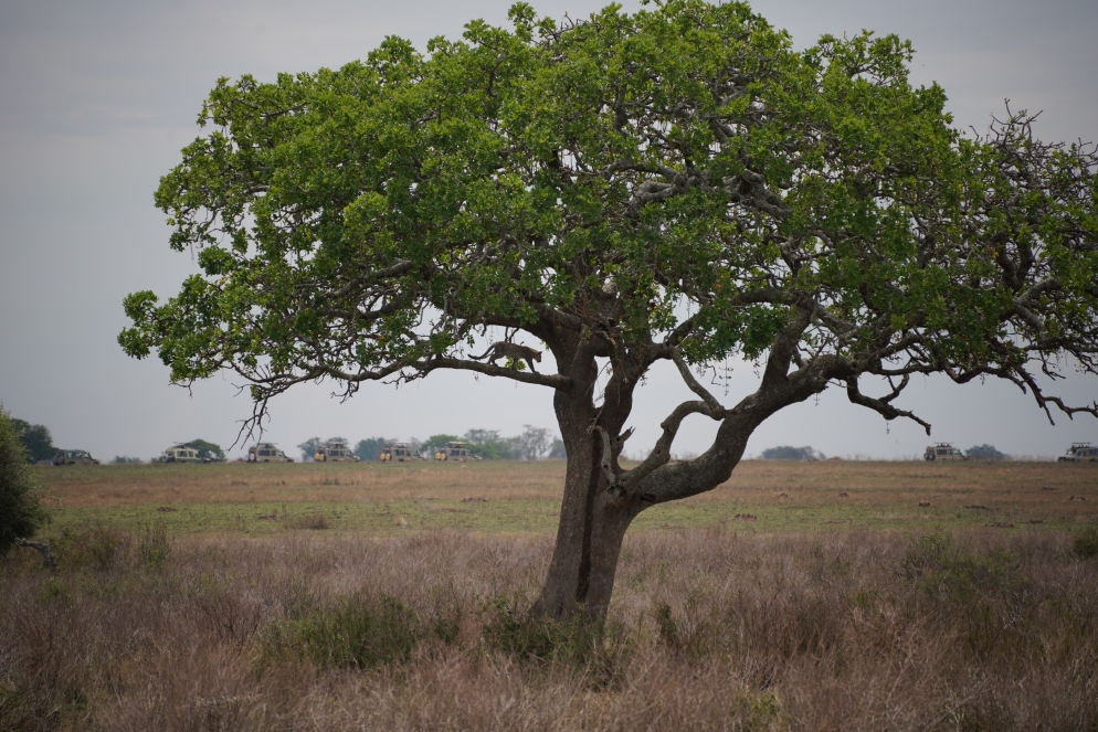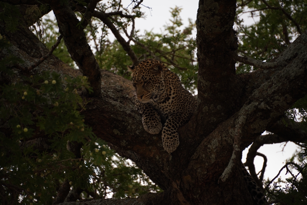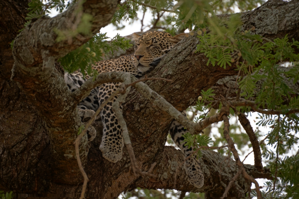 Heute war Leopardentag! Nach der späten Ankunft gestern geht es heute für unser Auto erst um 8:00h los, die andere Gruppe startet bereits um 7:00h. Los geht es mit Büffeln und auch gleich ein paar müden Löwen, die hatten in der Nähe einen Büffel erlegt und waren nach der Mahlzeit platt. Den Büffel mit den verbliebenen noch hungrigen Löwen haben wir auch gesehen,  allerdings im hohen Gras. Der Holzfäller und seine Frau als auch die Haweianer sind ganz scharf auf Giraffen. Also ging es wie gewohnt weiter, mit Giraffen, Hippos, Krokodilen, allerlei Vögeln und plötzlich den ersten beiden Leoparden. Je einer auf einem Baum, ca. 100m auseinander. Leider viel zu weit entfernt um richtig gute Fotos zu machen. Also geht es weiter zum Picknickplatz. Wir haben unsere Lunchbox aus dem Hotel, die ist nicht schlecht, aber was andere Gruppen anschleppen lässt einem schon das Wasser im Mund zusammen laufen. Nach dem Essen sehen wir den dritten Leoparden, der liegt schlafend im Baum. Aber erst einmal will Guide Thomas zu einem Geparden der mit Jungtier im hohen Gras liegt. Leider auch kein Bild, da das ganze verdeckt ist. Zurück zum Geparden, der ist wirklich auf dem Präsentierteller. Dann geht es auch schon langsam wieder Richtung Hotel. Aber die Amerikanerin findet immer wieder einen Vogel den sie sich von Thomas erklären lässt. Somit zieht sich die Rückkehr bis 17:30h, statt 16:00h. Nun gut den einen oder anderen spannenden Stopp bei Elefant und Giraffe gab es auch noch. Nach der Ankunft im Hotel machen wir dort noch eine Runde und finden eine tolle Aussichtsterrasse mit Blick über die Serengeti. Hakuna Matata!