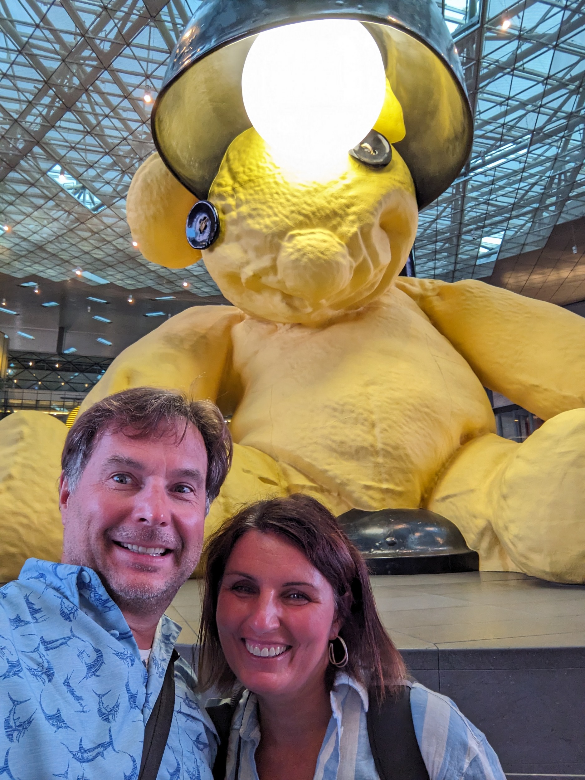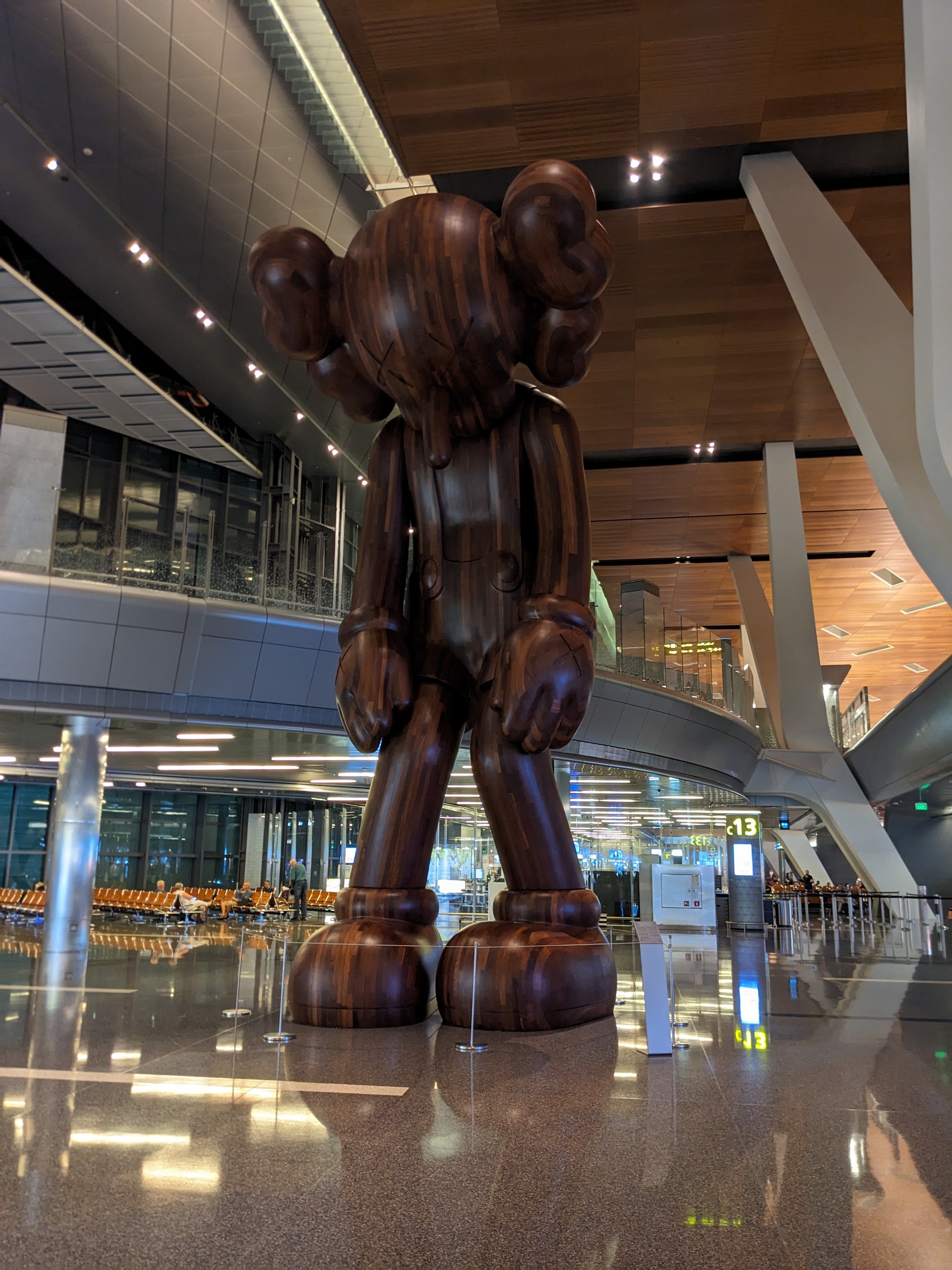 Der Flughafen Doha sieht von außen gar nicht so riesig aus, ist es aber, mit riesigen Skulpturen, endlosen Shoppingmalls mit allem was teuer ist und ziemlich langen Wegen. Um 1:50h geht es weiter, dann noch mal einige Stunden und wir sind am ersten Stopp angekommen.