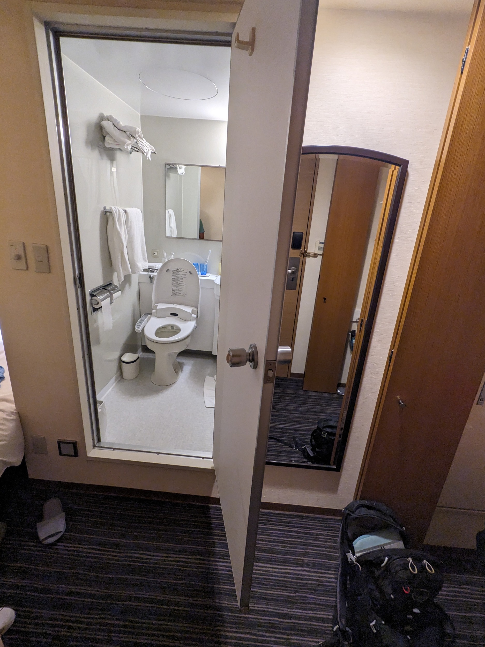 Mit einigen Pausen geht es weiter Richtung Tokyo und dabei entdecke ich die eine oder andere Kuriosität, z.B. die Reinigungsdamen auf der öffentlichen Toilette, die vor den Pinkelbecken knien und mit absoluter Hingabe diese von Hand reinigen, von innen sowie von außen. Dann am Eingang der Raststätte, dass Personen mit Tätowierungen keinen Zutritt zu Anlage haben, allerding hatte die Gaststätte einen angeschlossenen Onsen und da sind Tätowierungen verpönt weil dass die japanische Mafia auszeichnet. Im Hotel heute in Tokyo gibt’s Schlafanzüge vom Haus, die lagen schon mal auf dem Bett bereit. Nachdem wir gestern im Roykan die Bademäntel hatten mit denen man sich im Haus bewegen kann frage ich mich nun ob ich Morgen mit dem hauseigenen Schlafanzug zum Frühstück gehen kann.
