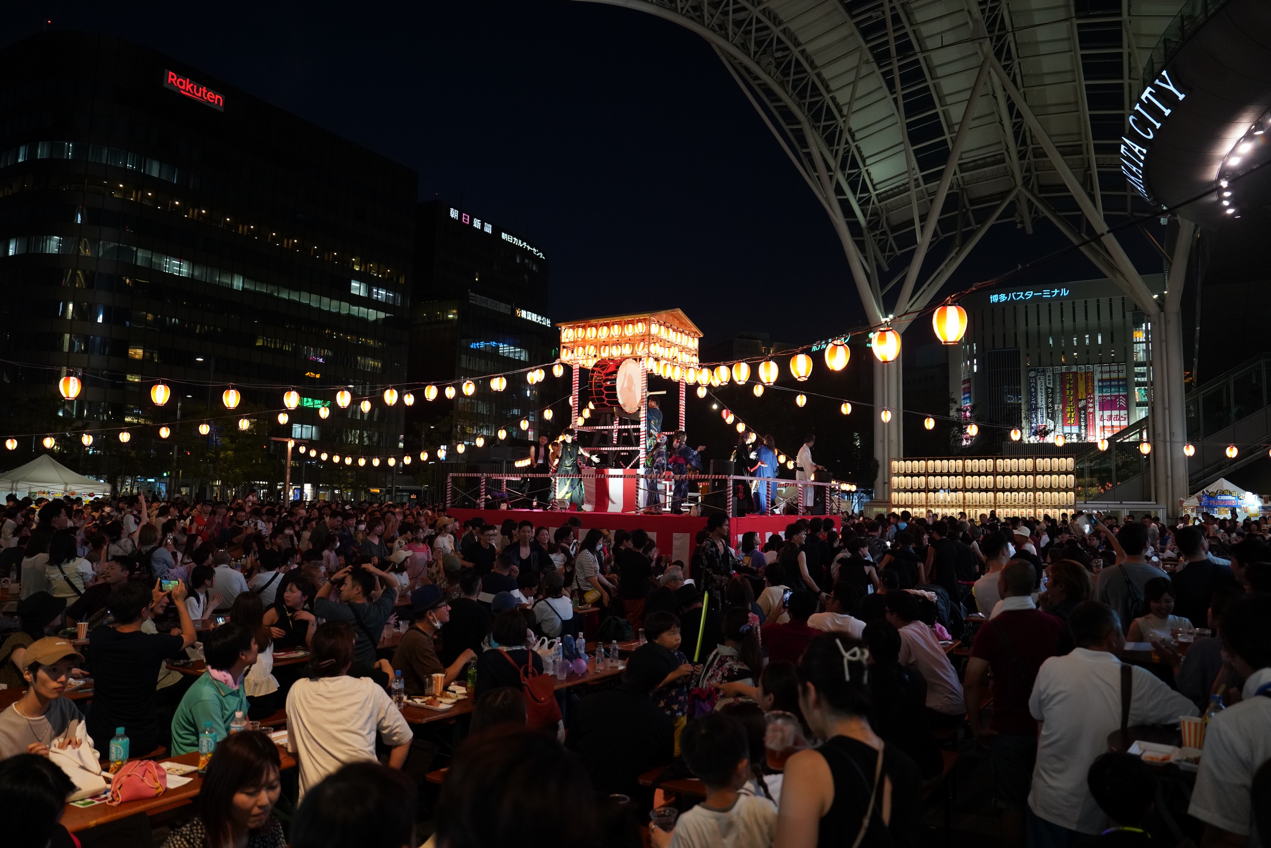 Was tun mit dem angebrochenen Abend, die Idee war zum Fukuoka Tower raus zu fahren und dort die Beleuchtung anzuschauen. Da es aber schon 19:30h ist, die Fahrt hin alleine ca. 30min dauert und wir beim besten Willen kein Busticket auftreiben können lassen wir den Plan fallen und schließen uns dem Hakata Sommerfestival auf dem Bahnhofsvorplatz an. Das war irgendwie verwirren aber auch wieder normal. Es gab Bier und andere Alkoholika, diverse Essensstände von denen wir ohne groß zu Überlegen probiert haben. Für den Schweinezungenspieß oder den Hühnerhautspiess waren wir noch nicht bereit, aber vor Octupusbällchen, Gyoza, Nudeln und Edame hatten wir keine Angst und haben diese mit Bier runter gespült.
