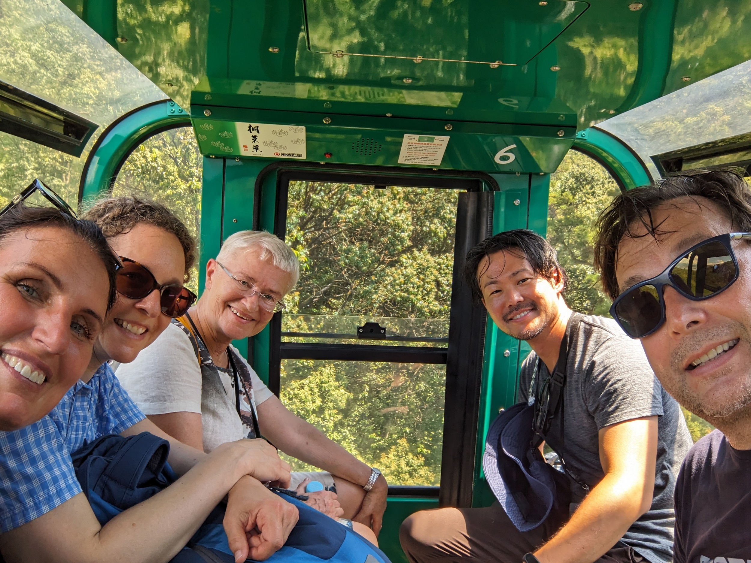 Heute stand ein Ausflug zu einer der Top Attraktionen von Japan an, der Besuch von Miyajima mit dem Itsukushima Schrein. Aber statt mit Zug und der gewöhnliche Fähre dort hin zu fahren nehmen wir die Personenfähre vom Peace Park aus, die nur 10 min vom Hotel entfernt ablegt. Nach ca. 40 min Fahrt sind wir bereits da und laufen in ca. 10min zum Itsukushima Schrein. Das Rote Gate ist nicht zu übersehen und die Schlange für ein Selfie davor ist beeindruckend. Der Rest form Schrein ist wie andere Schreine auch aber natürlich entsprechend stark besucht. Im Anschluß gehen wir hoch auf den Berg Misen mit 535m, eigentlich könnte das eine schöne Wanderung sein, bei den Temperaturen die wir hatten war die Seilbahn die bessere Alternative, zumal noch 100 Höhenmeter gelaufen werden mussten die doch sehr schweißtreibend waren. Dafür eine unbeschreibliche Aussicht über das Meer und auf Hiroshima und weitere schöne Tempel bzw. Schreine auf dem Weg. Nach einem leichten Lunch ging auch schon um 16:25h die Fähre zurück nach Hiroshima. Nach einem kurzen Besuch in einem Japanischen 1 EUR Laden und kurzem Aufenthalt im Hotel war dann auch schon Zeit fürs Abendessen, es gab Sushi, auch wenn Ricky dadurch sehr mit dem Budget zu kämpfen hatte. Jetzt müssen wir unser Gepäck auf den Bedarf für 3 Übernachtungen reduzieren da alles nach Kyoto vorgeschickt wird. Also noch ein wenig puzzeln und dann die Koffer runter bringen wo sie auch Morgen wenn wir das Hotel verlassen mit Sicherheit noch stehen werden.