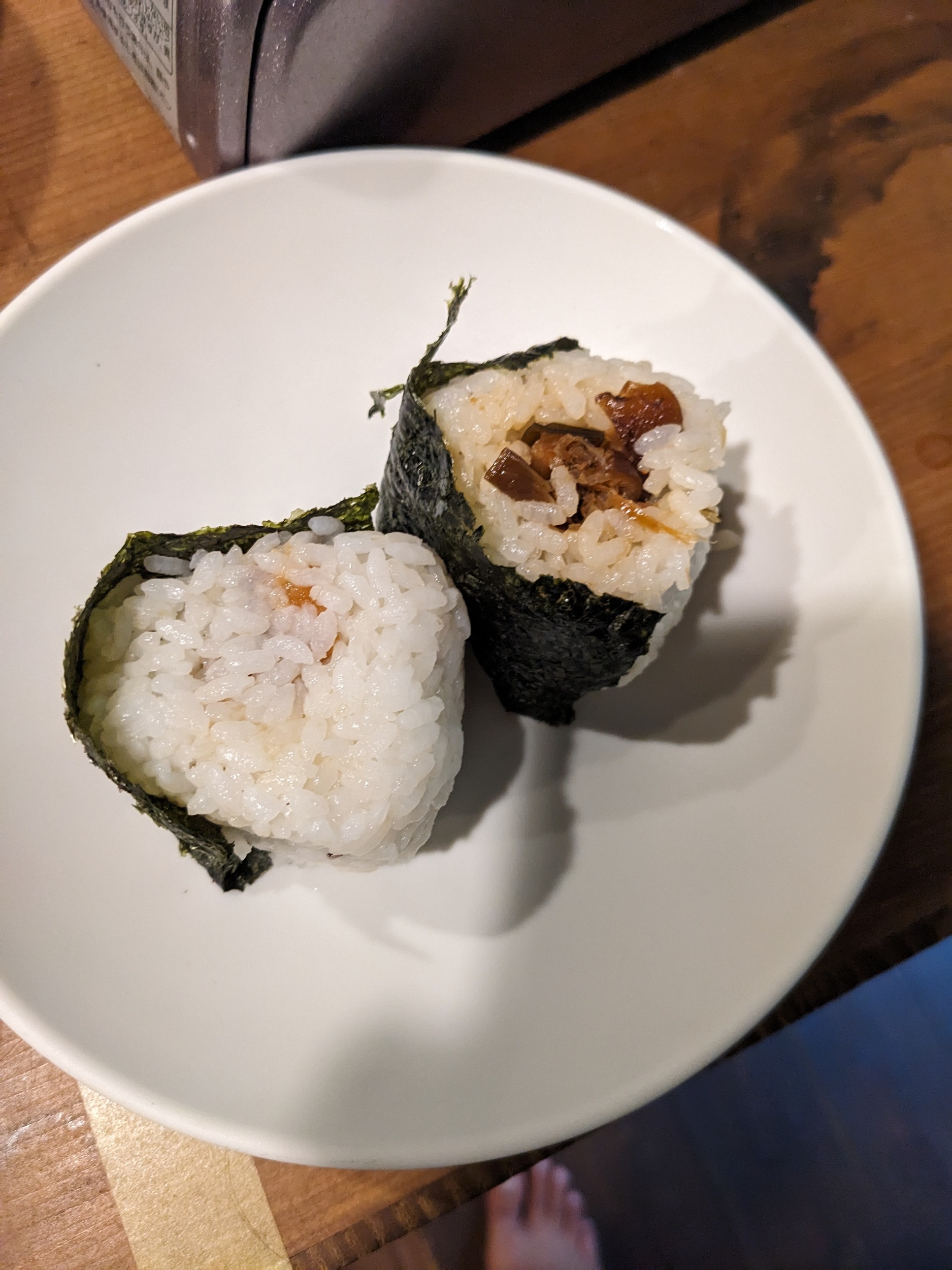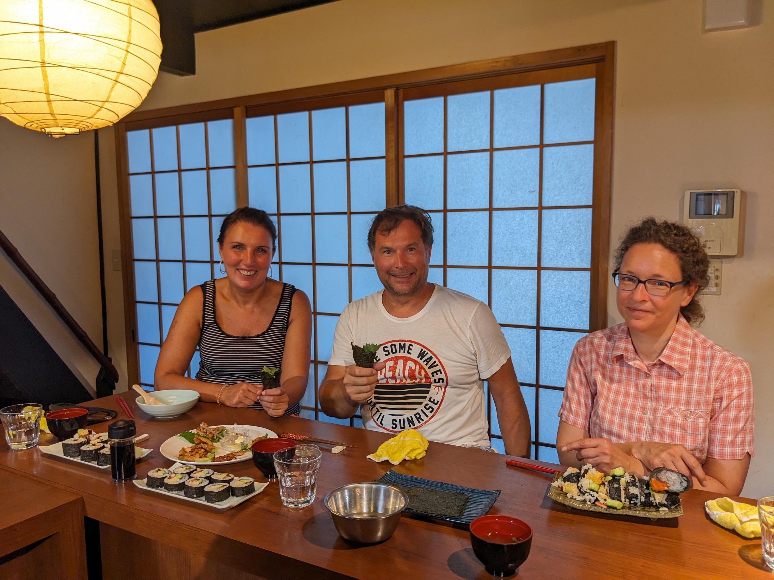 Dann ging es noch mal mit dem Zug weiter aufs Land, nach Okawara, vorbei an Reisfeldern, dort wurden wir bereits von unseren Hosts empfangen. Wir bleiben bei Linda, sie fährt uns mit Ihrem K-Car noch 15 min durch eine wunderschöne Landschaft mit Teeplantagen bis wir bei Ihr zu Hause sind. Das Haus ist ein ehemaliger Tempel den Sie mit Ihrem Vater zum Wohnhaus umgebaut hat. Zum Abendessen gibt es eine spezielle Art von Sushi mit frittiertem Tofu und einem Gemüsesalat aus Kürbis und Aubergine. Alles sehr lecker! Wir können uns mit Linda ein wenig auf Englisch verständigen und tauschen uns aus, was wir beruflich machen. Sie hat neben dem Übernachtungsgeschäft noch weitere Jobs, unter anderem bäckt Sie auf dem Farmersmarket Octupusbällchen wie wir sie in Fukuoka gegessen haben. Dabei haben wir auf der Reismatte gesessen an einem Couchtisch, wie man das hier traditionell macht, jetzt bin ich froh, wenn ich bald meine Glieder ausstrecken kann.