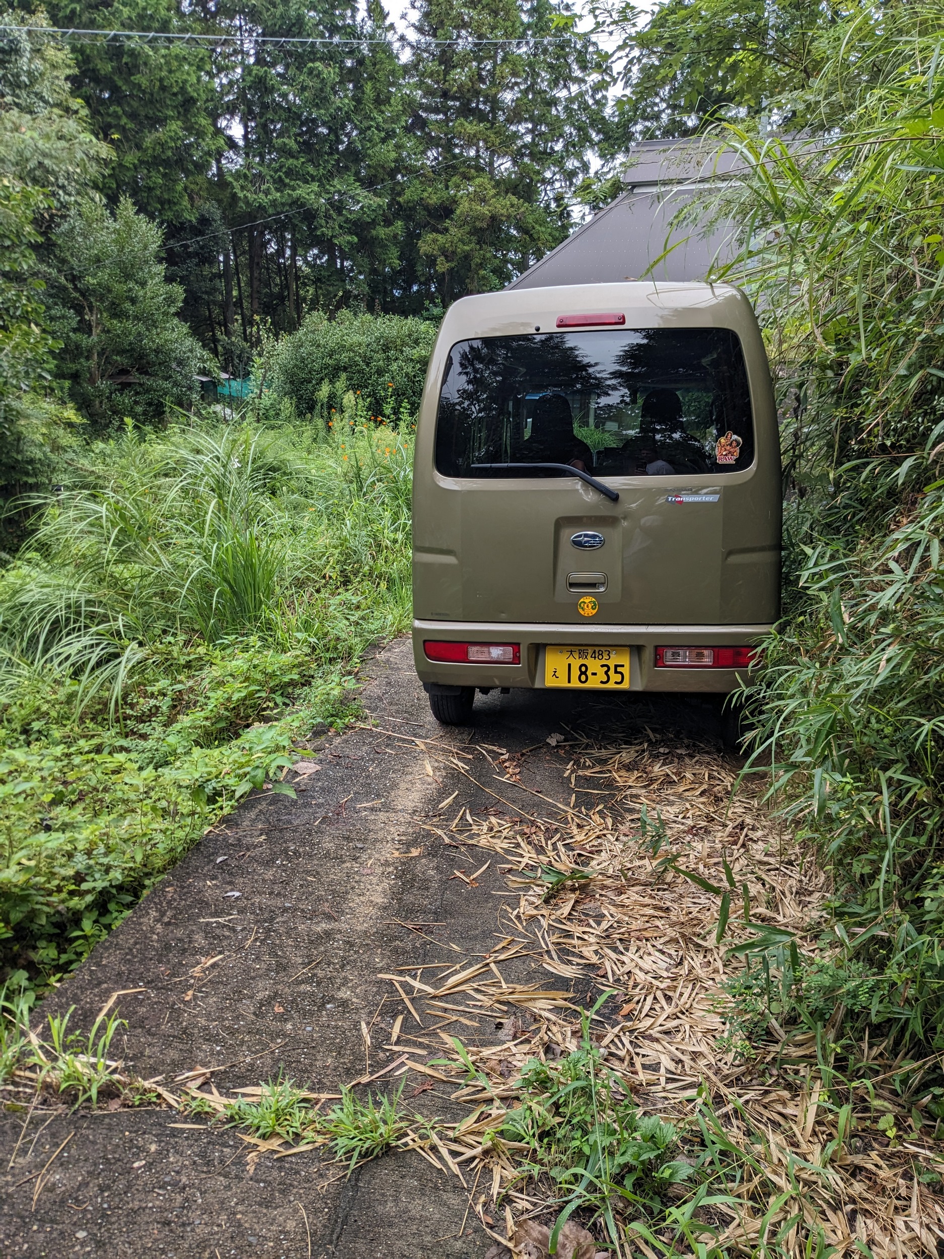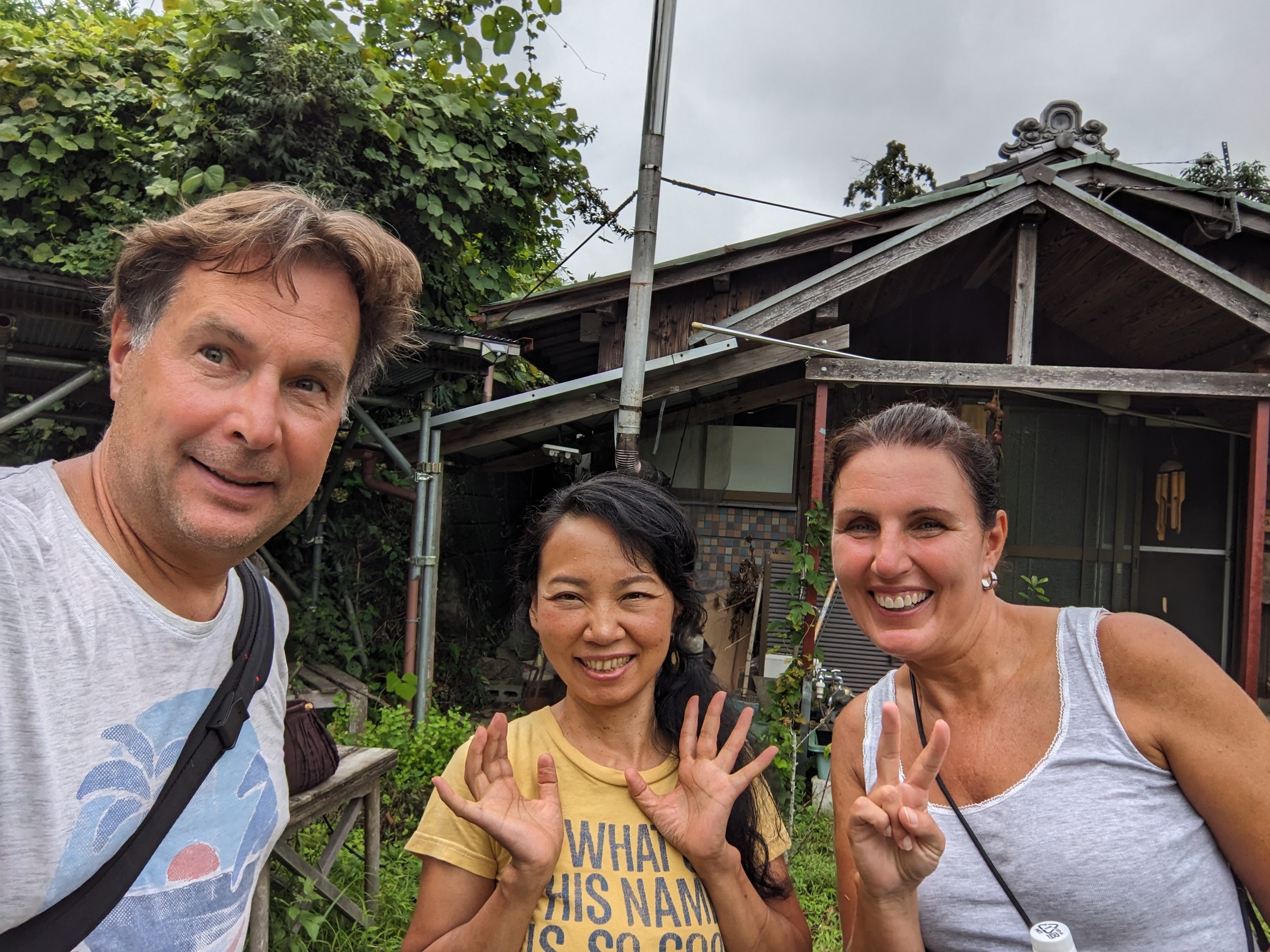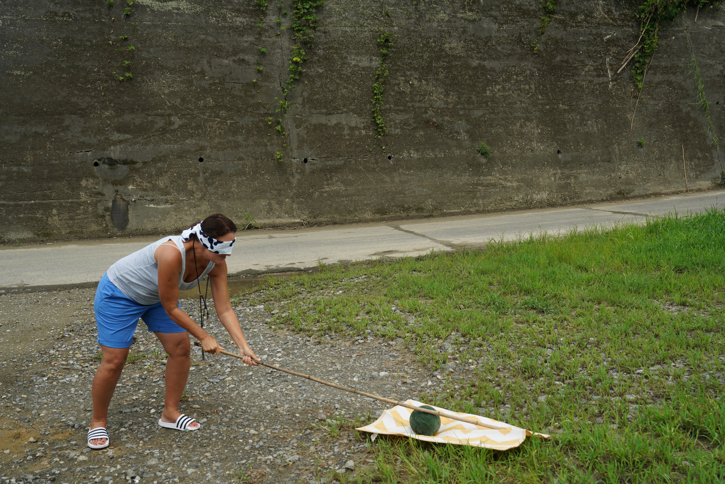 Wir sind um 7:00h aufgestanden, weil für 7:30h hatte sich Linda in ihrem Haus angemeldet. Die Nacht auf dem Futon war hart, gut, dass ich das nicht jede Nacht habe. Erst mal ging es ans Frühstück machen, Aus dem Reis von gestern formen wir Reisbällchen die zum einen mit dem Kombu und Bonitoflocken von der Misosuppe gefüllt werden, zum anderen gibt es eine Misosuppe. Eigentlich ganz simpel, Dashi kochen, das ist Kombu und Bonitoflocken. Dann Zwiebeln und Kartoffeln rein und zum Schluss noch zwei große Esslöffel Misopaste. Das war ein leckeres Frühstück. Eva darf noch einen Kimono anprobieren und dann brechen wir auf zu Wassermelonenpicknick am Fluss mit Besichtigung eines Schreins im Ort. Beim Picknick machen wir Watermelon-Crash, Eva muss mit verbundenen Augen die Melone mit einem Bambusstab zerteilen. Zum Schluss fährt sie uns mit ihrem K-Car zum Farmersmarket wo es allerlei aus der Region zu kaufen gibt. Der Aufenthalt bei Linda war schön, ein guter Einblick in das Leben auf dem Lande. Auch wenn ich glaube, dass nicht alle so einfach wie Linda leben war es eine tolle Erfahrung.
