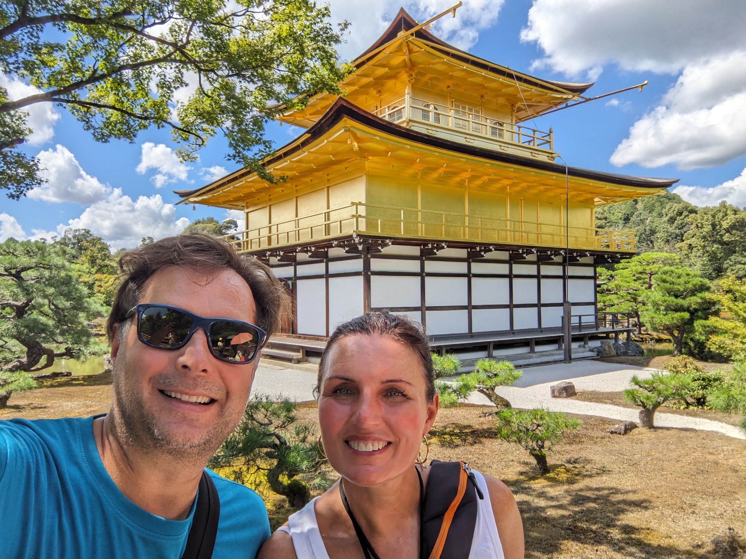 Heute erkunden wir Kyoto und die umliegenden Sehenswürdigkeiten mit öffentlichen Verkehrsmitteln und das war ein höchst ereignisreicher und schöner Tag. Erst mal ging es zum goldenen Tempel Kinkaku-ji ein wunderschön vergoldeter Tempel mit einer tollen Gartenanlage mit großem Teich. Das war ein wirklich spitzen Auftakt, auch wenn wir keine Zeit hatten das Ganze in Ruhe auf uns wirken zu lassen. Von dort sind wir zu Fuß in ein Sushi Schnellrestaurant gegangen, das war laut und es gab viel Sushi für kleines Geld. Alles wurde über ein Tablet bestellt und wenn unsere Bestellung auf dem Karussell ankam hat es gebimmelt, wie bei den anderen Gästen auch, also war das ein riesen Getöse, zusätzlich zu den üblichen Jingels die hier in Japan überall zu jeder passenden und unpassenden Gelegenheit ertönen.