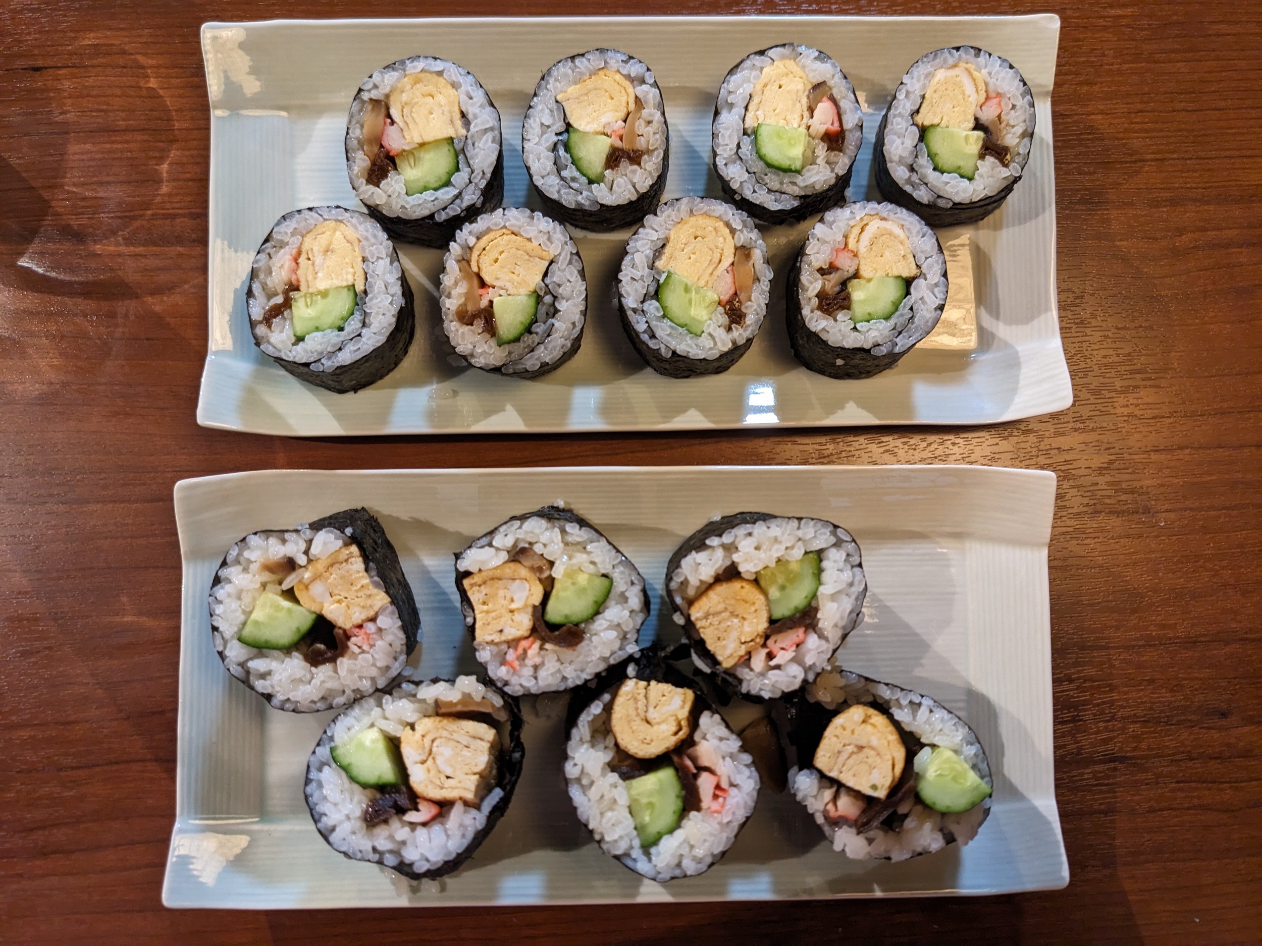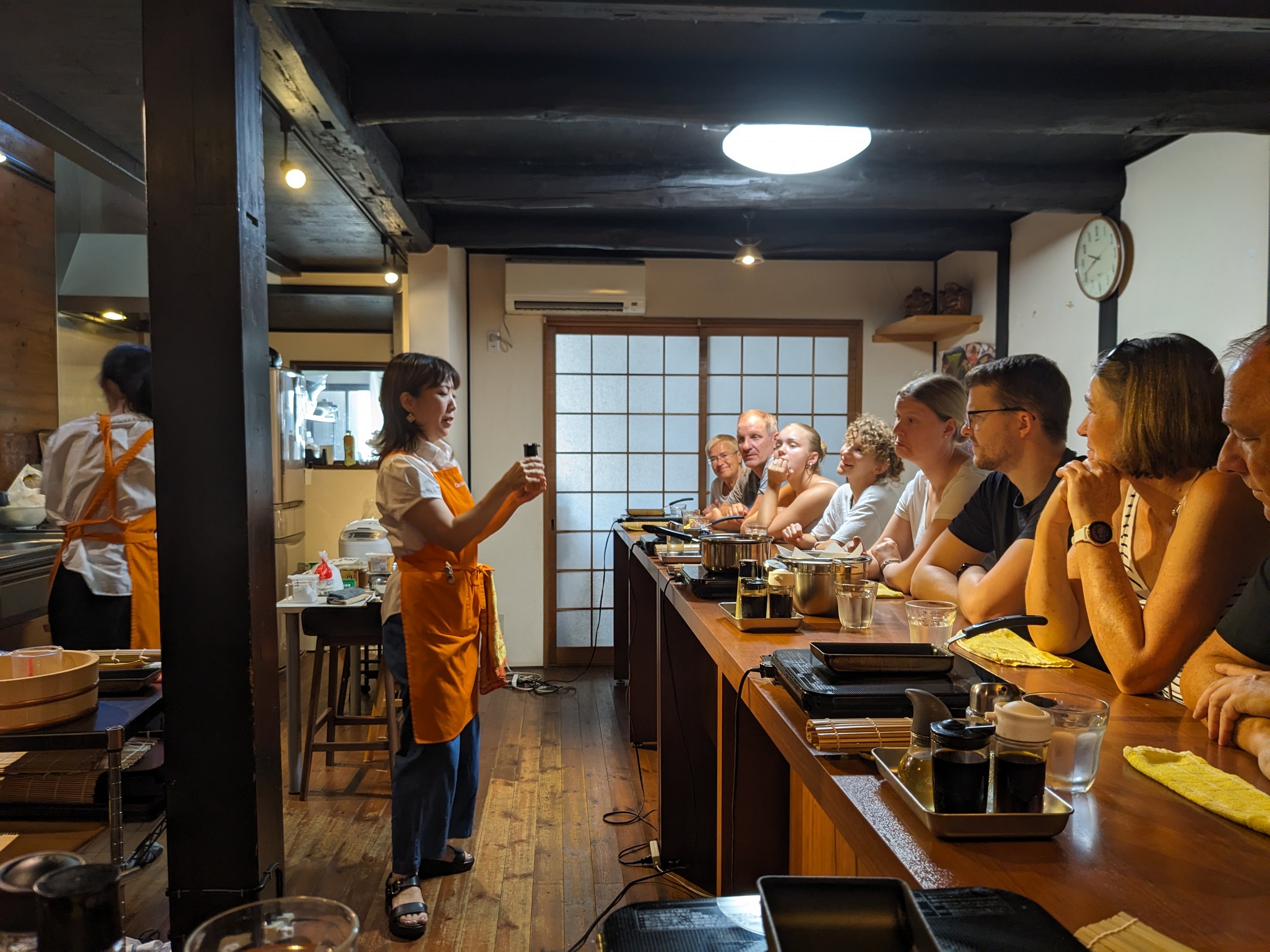 Heute ging es zu einer christlichen Zeit los, Start zu unserem Sushikurs war erst um 9:15. Der Kurs selbst war nur 2 Straßen weiter in einem kleinen Studio und wurde von zwei japanischen Damen geleitet. Wir haben zunächst Dashi gekocht, dann japanisches Rührei mit Dashi gemacht. Weiter noch Teryaki Chicken. Dann mussten wir den Reis würzen und schließlich zu einer dicken Makirolle zusammenbauen. Zum Schluss haben wir noch eine Sushitüte gebaut, das Ergebnis weggeputzt und schon war der Kurs vorbei.