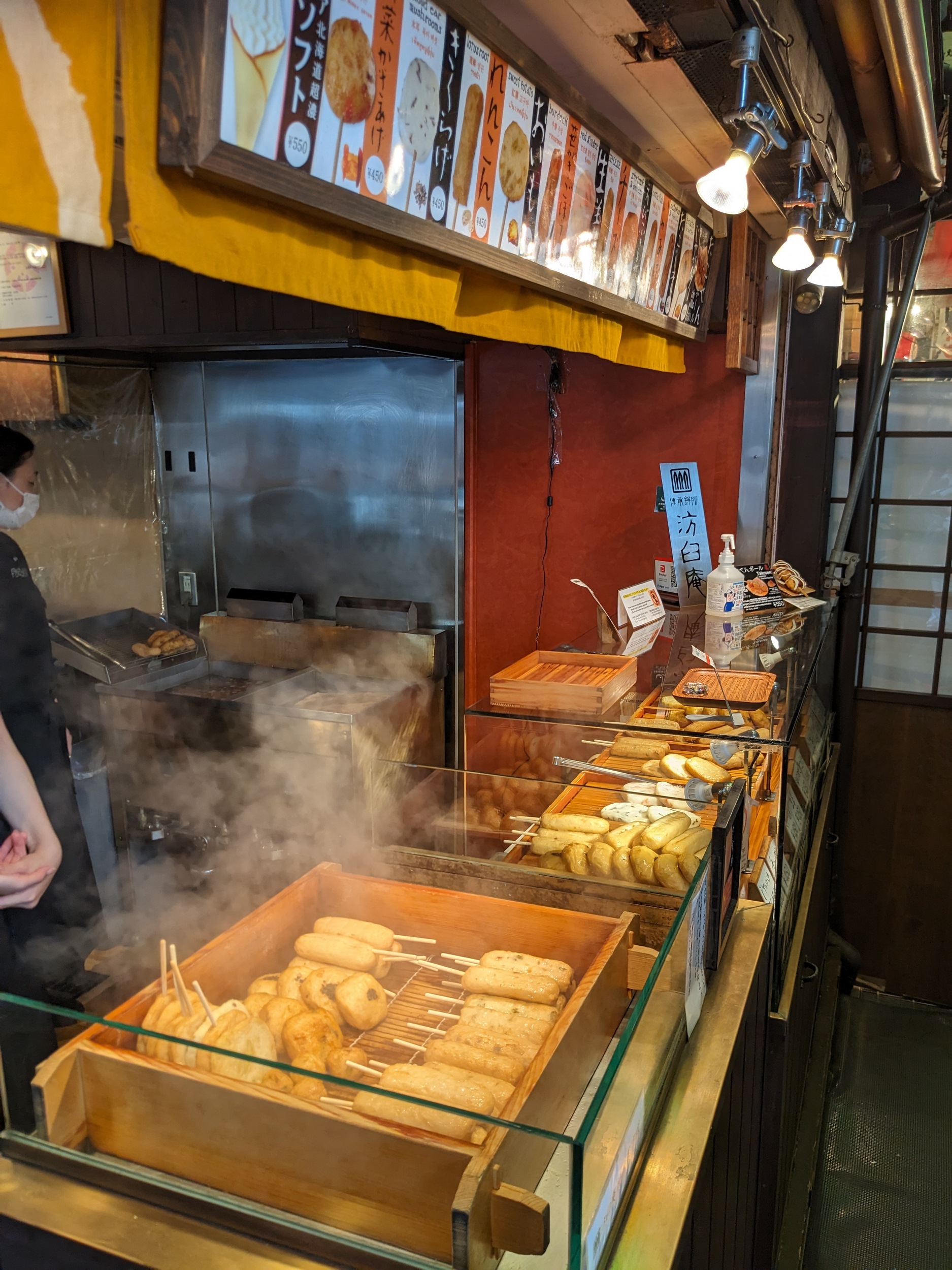 Danach waren wir wieder motiviert und wir wollen shoppen, bei der Wegeplanung hab ich zufällig den Nishiki-Market entdeckt, der war durch und durch kulinarisch, insgesamt bestimmt 500m lang auf einer Straße, links und rechts kleine Geschäfte mit wirklich allem was die japanische Küche hergibt. Angefangen habe ich mit einem Sesam Motchi, dann gab es einen Snack am Stiel mit Zwiebel und Garnele, was das ganze zusammengehalten hat weiß ich noch nicht, war aber sehr lecker. Dann kam ein Garnelen Spieß, Reiscracker, Wagyu Spieß, Gyozer mit Schwein und Wagyu und alles an das ich mich nicht mehr erinnern kann. Nach der Stück Straße sind wir erst mal ins Hotel gerollt.