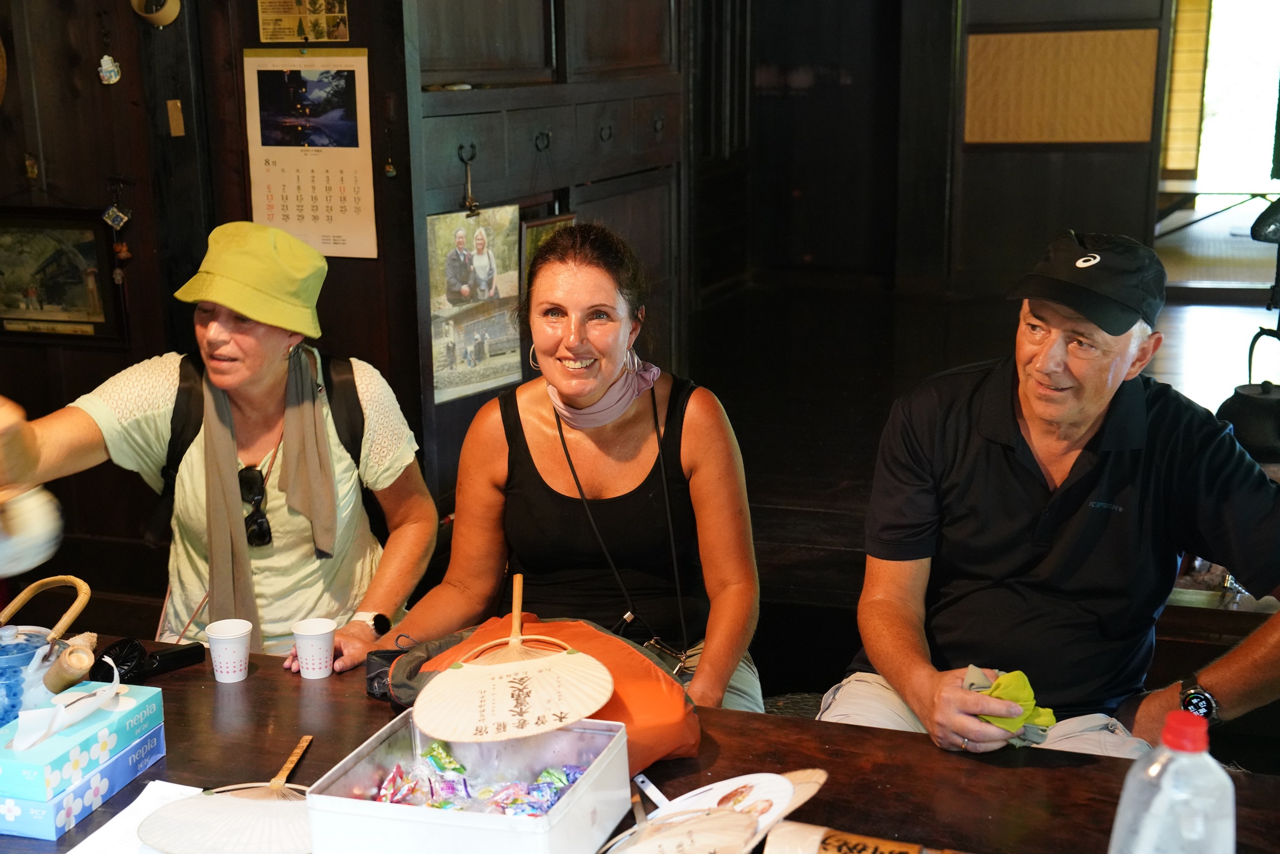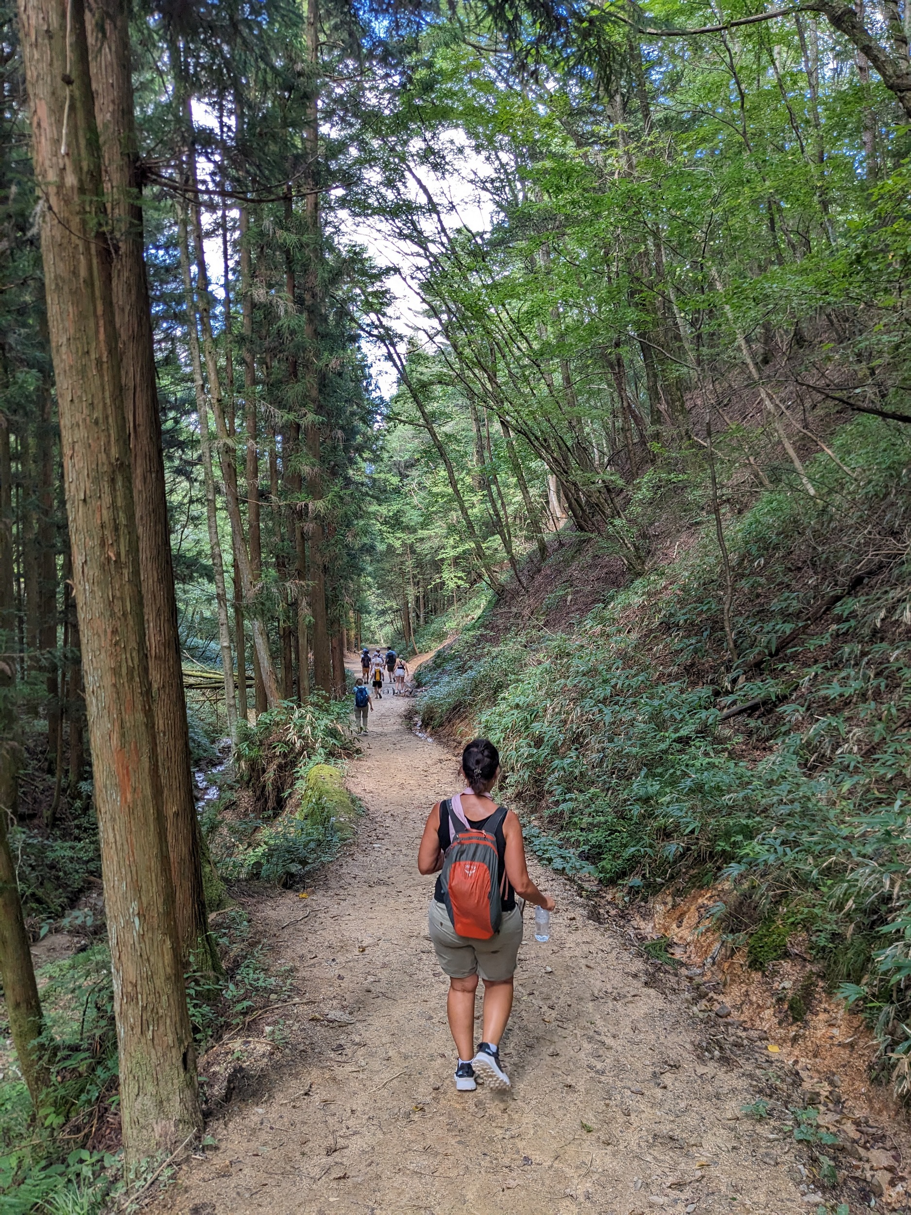 Das eigentliche Programm heute war sehr schön, wir haben eine leichte 8km Wanderung von Magome nach Tsumago auf dem Nakasengo Highway gemacht. Der Nakasengo Highway verband im 17. Jahrhundert die Städte Kyoto und Tokio. Es ging 200m bergauf und dafür insgesamt 400m bergab, trotzdem war es bei 30 Grad kein Selbstläufer. Der Wald war schön, man sollte regelmäßig mit einer Glocke die Bären vertreiben und ein gutes Stück des Weges ging an einem Bach entlang der auch noch zwei kleine Wasserfälle zu bieten hatte. Die beiden Dörfer waren sehr malerisch, die Tour hat sich gelohnt und wir haben ein wenig vom ländlichen Japan gesehen. Am Ende gab es noch ein spezielles Motchi als kleine Stärkung und wir haben uns zusätzlich noch ein gefülltes Brötchen geholt. Ab 15:00h ging dann die Tortour mit Bus, Bahn und noch mal Bus wieder weiter bis wir im Roykan waren.