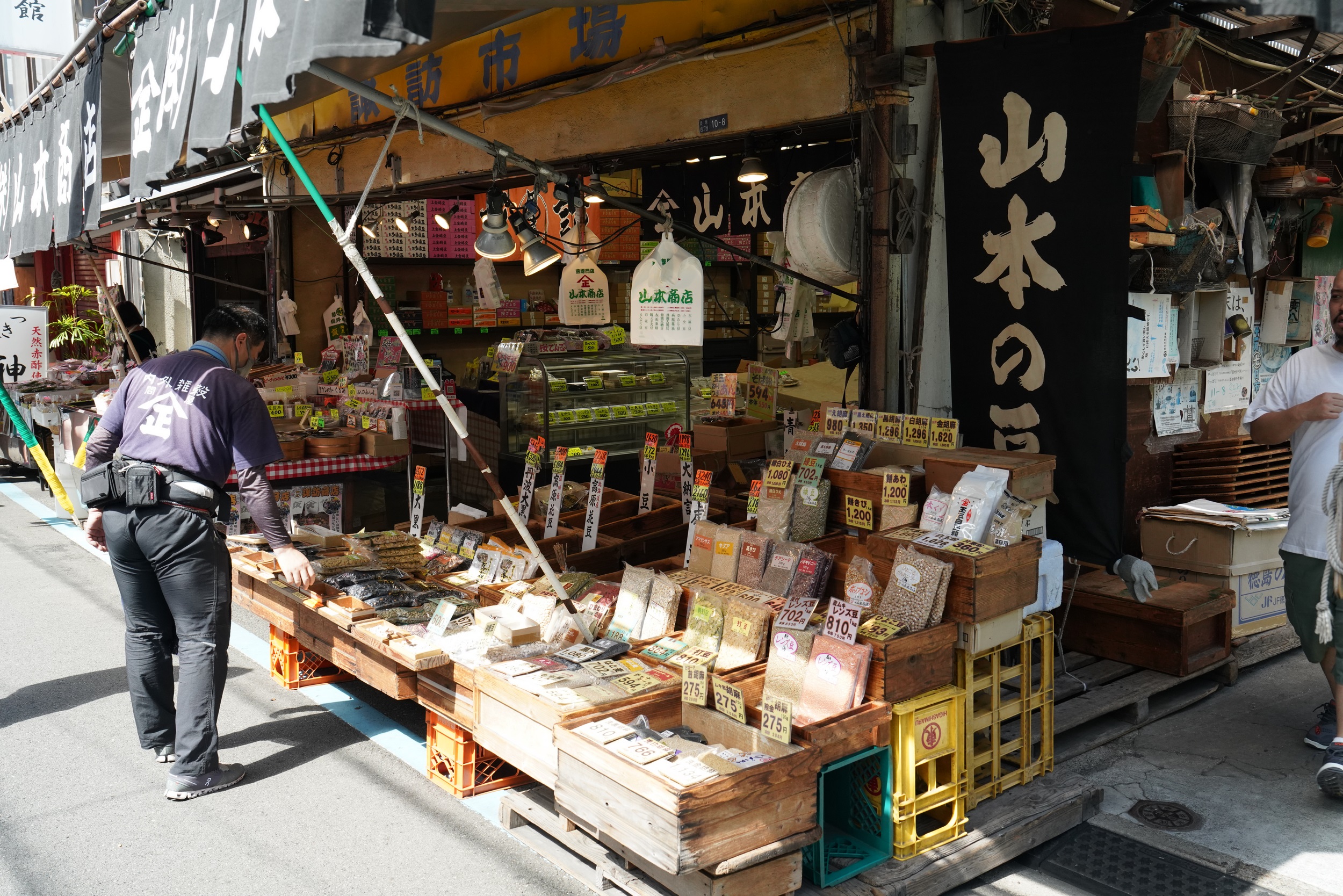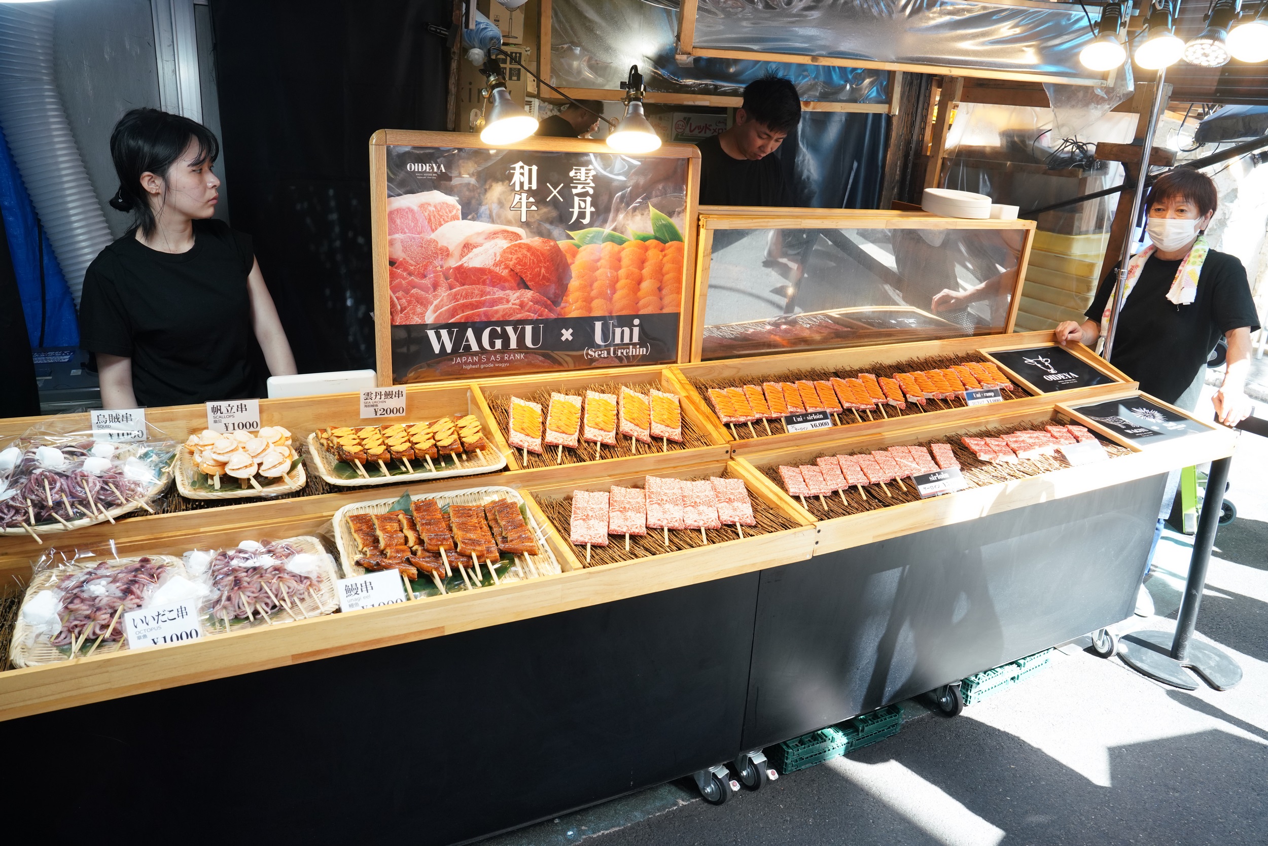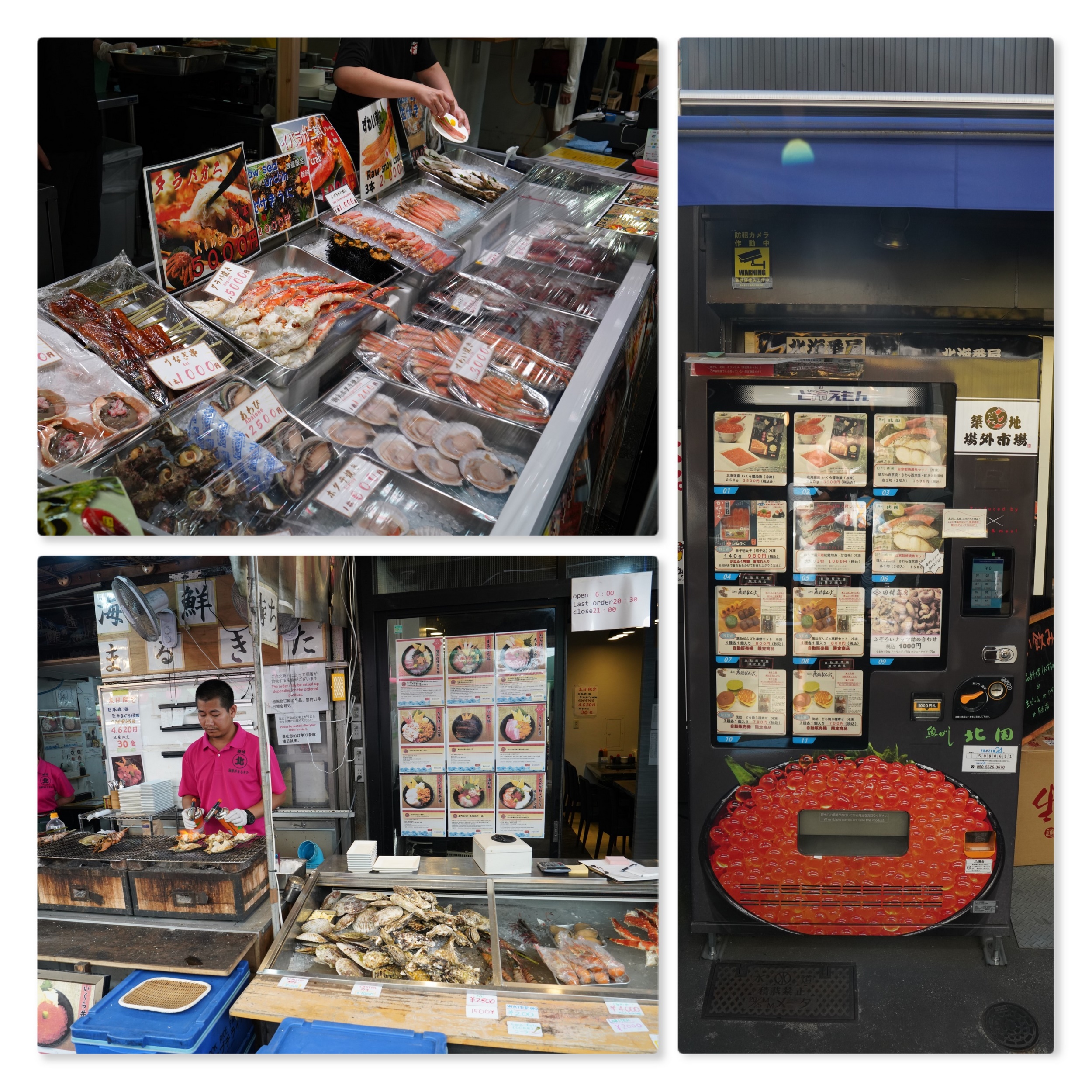 Wir haben uns nach einer Pause im Hotel noch mal auf den Weg zum Fischmarkt gemacht um dort Essen zu gehen. Von dem geschäftigen Treiben vom Morgen war nichts mehr geblieben, einzig einige der Restaurants hatten noch auf. Erst mal haben wir uns einen sehr leckeren Wagyu Spieß geteilt, der schmolz auf der Zunge. Dann gab’s heute noch mal Sushi, lecker aber nicht zu vergleichen mit gestern.