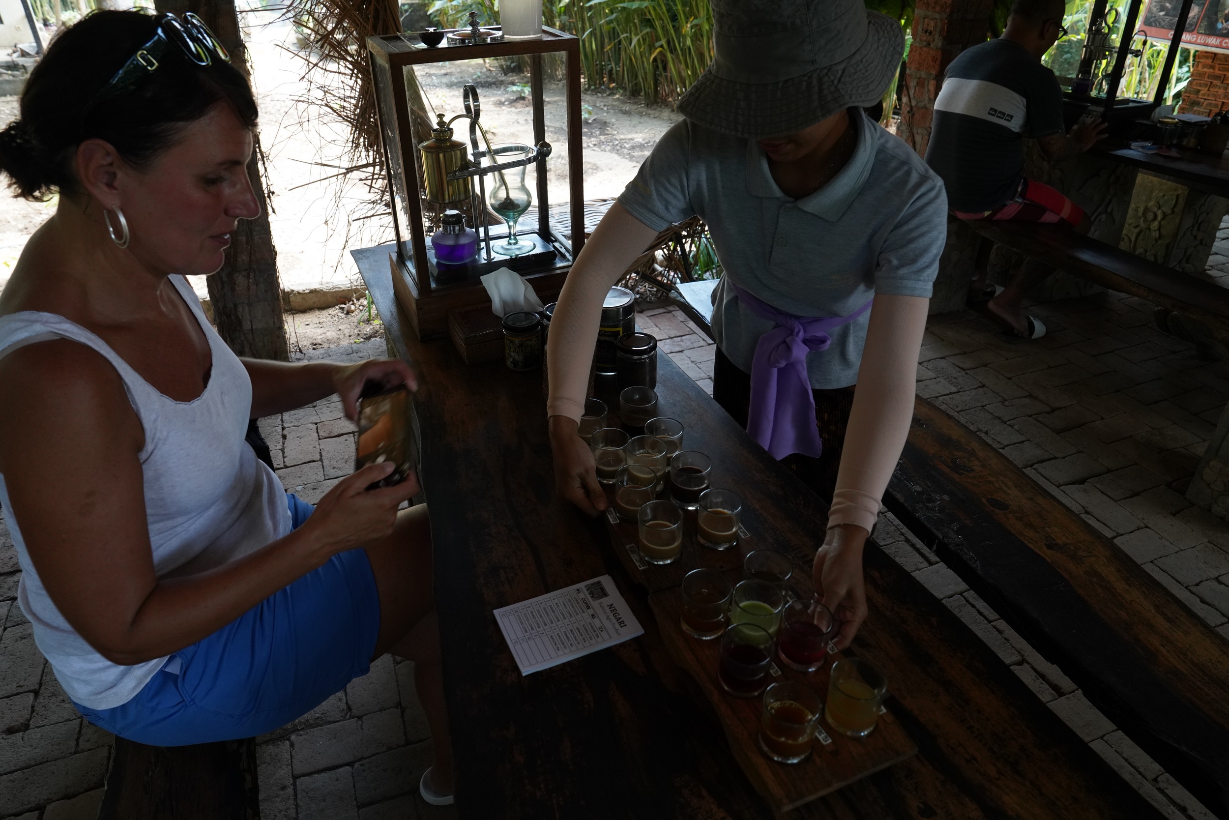 Danach ging es in eine Batikbude, Baskara meinte für die Besichtigung der Tempel brauchen wir einen Sarong. Die haben auch schöne Sachen, wir sind aber nicht bereit so viel Geld auszugeben und fragen so lange nach was Billigerem bis wir an dem Stapel mit den günstigen Sarongs angekommen sind. Weiter zur Silberschmiede, es wird kurz gezeigt wie das abläuft und dann ab in den Verkauf. Ich befürchte schon, dass die kommenden Tage zu einer Verkaufsveranstaltung werden. Dafür war die Tee und Kaffee Verkostung sehr schön in einem Garten. Wir konnten diverse aromatisierte Kaffees und verschiedene Kräuter- bzw. Früchtetees probieren. Mitgenommen haben wir dann den Rosellatee, der schmeckte gut und davon soll man abnehmen. Das war’s dann auch mit den Verkaufsveranstaltungen.