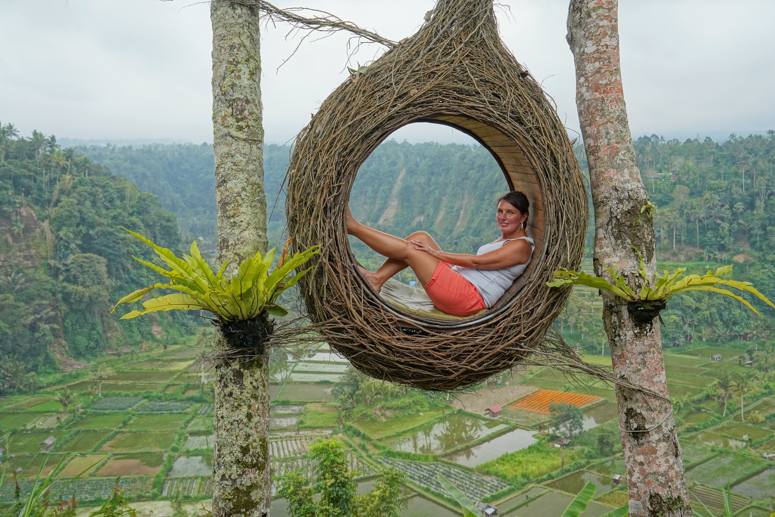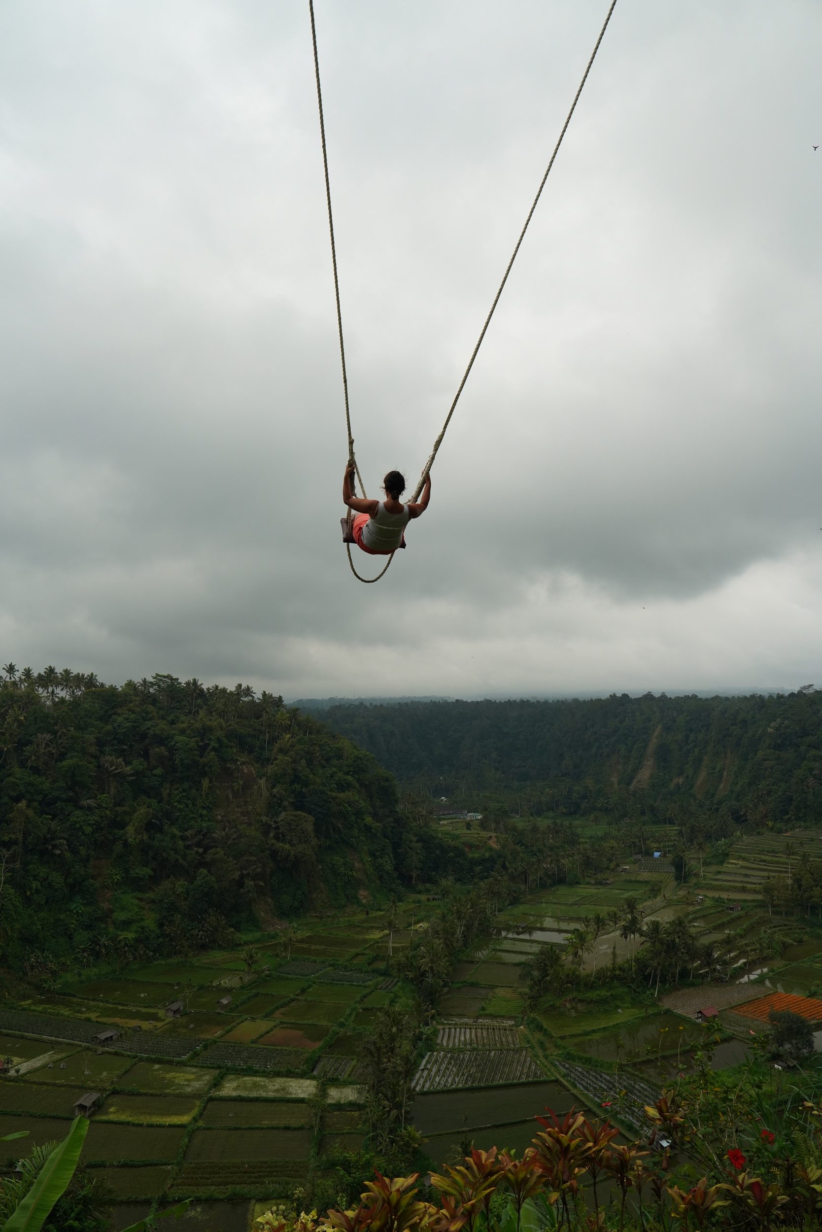 Weiter geht’s zum größten Tempel auf der Insel, Besakih mit Blick auf den höchsten Vulkan von Bali. Beides haben wir nicht gesehen, den Vulkan nicht mal ansatzweise, den Tempel nur im dichten Nebel. Schade, eins der Highlights. Nach der Abfahrt vom 900m hoch gelegenen Tempel gibt es zum Mittagessen noch einmal einen Stopp an den Reisterrassen, mit Schaukelmöglichkeit. Das hat Eva nach dem Essen dann auch ausgenutzt.