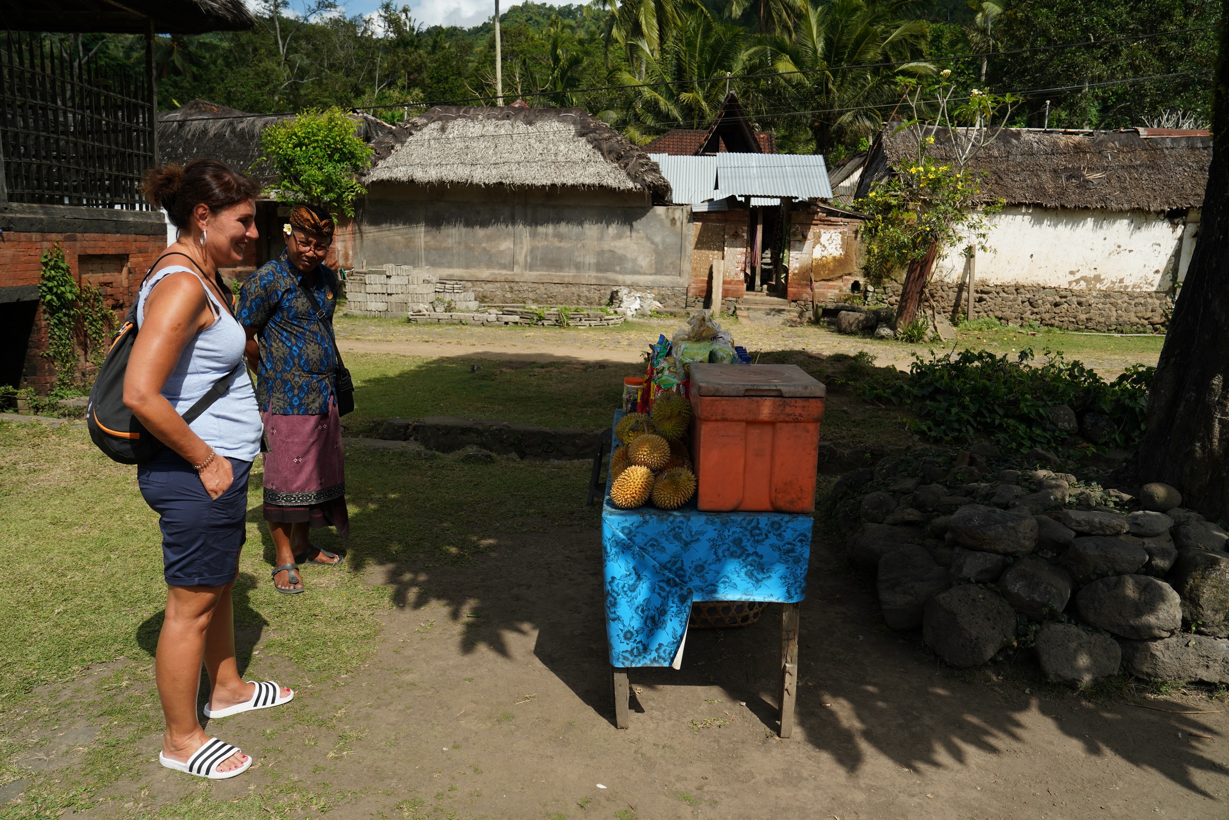 Heute mussten wir viel Zeit im Auto verbringen, die reine Fahrzeit von Candi Beach nach Lovina war ca. 3,5h. Doch es gab den einen oder anderen Stopp auf der Strecke. Angefangen in Tenganan, einem weiteren ursprünglichen Dorf, wobei dieses nicht dadurch glänzt, dass es bis zum letzten herausgeputzt ist, sondern wirklich lebhaft ist. Die Hähne sitzen in Ihren Käfigen auf der Straße, die Hühner stolzieren um die Hähne herum, zwei Büffel grasen friedlich auf dem Dorfplatz und verschiedene Souvenierverkäufer preisen ihre Arbeiten. Das strahlt eine ganz andere Lebendigkeit aus als das Dorf gestern. Hier ergreifen wir die Chance und kaufen eine kleine Durian, auch Stinkfrucht oder Kotzfrucht genannt. Wenn diese irgendwo rumliegen riecht man sie schon von weitem. Ein altes Mütterlein hat auf Ihrem Stand neben verschiedenen Getränken und Snacks auch Durians. Die Dame holt Ihr Messer und Wasser zum Händewaschen und los geht es. Den Geruch nimmt man schnell nicht mehr so sehr wahr. Die Frucht selbst schmeckt gar nicht übel. Ist halt wie bei dem einen oder anderen Käse, da darf man auch nicht dran riechen. Baskara hilft uns beim Aufessen und preist die Vorzüge der Durian auf die Manneskraft, insbesondere wenn diese mit Bintang Bier runter gespült wird. Jedenfalls scheint das Mütterchen das Geschäft des Tages in Höhe von 2,50EUR gemacht zu haben, sie dankt uns mehrfach überschwänglich.
