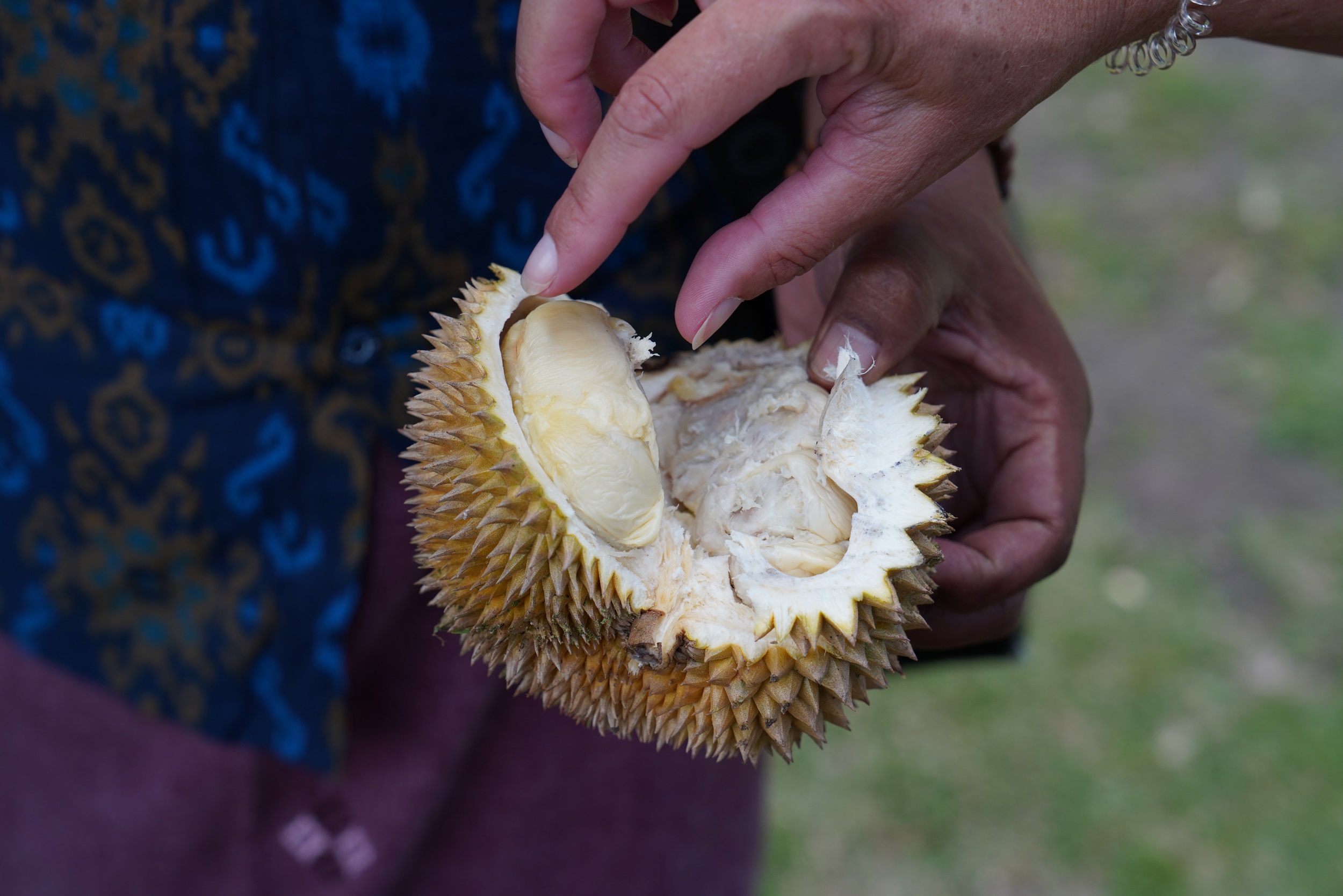 Auf der Weiterfahrt ist unser Fahrer Kadek sicher nicht begeistert von unserem Atem, laut Baskara kennt er das aber schon. Der Geschmack der Frucht hält sich hartnäckig im Mund und selbst beim Mittagessen kommt es zwischen den Bissen immer wieder mal durch.