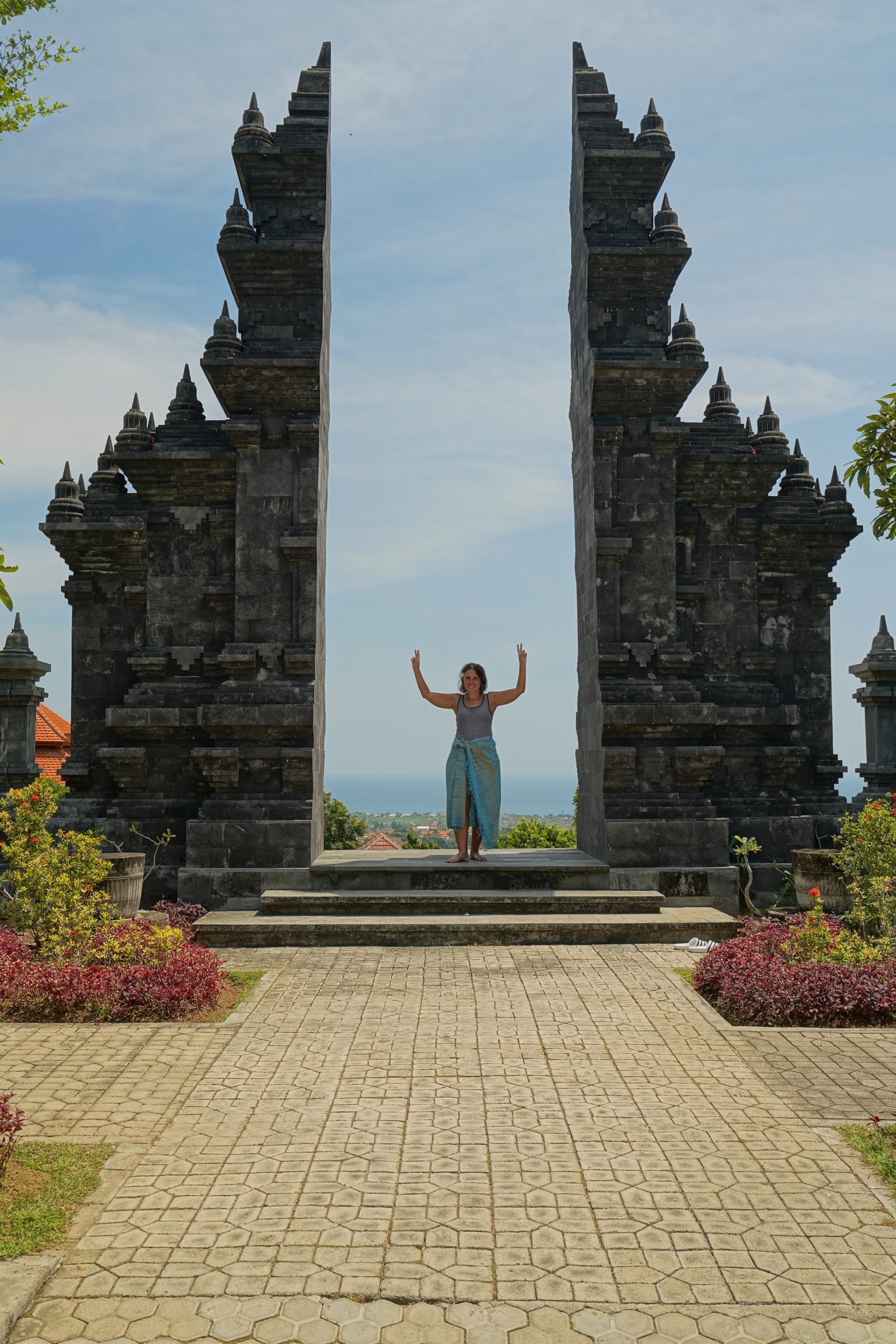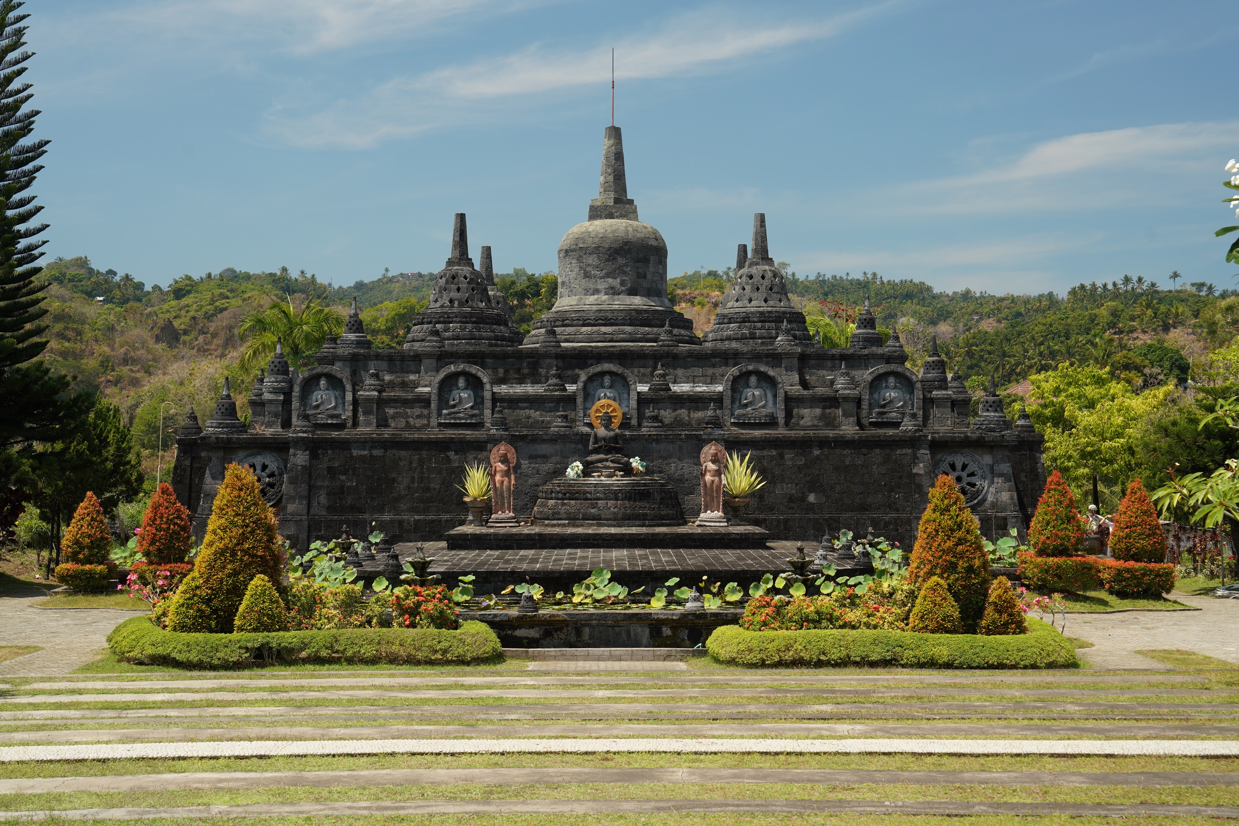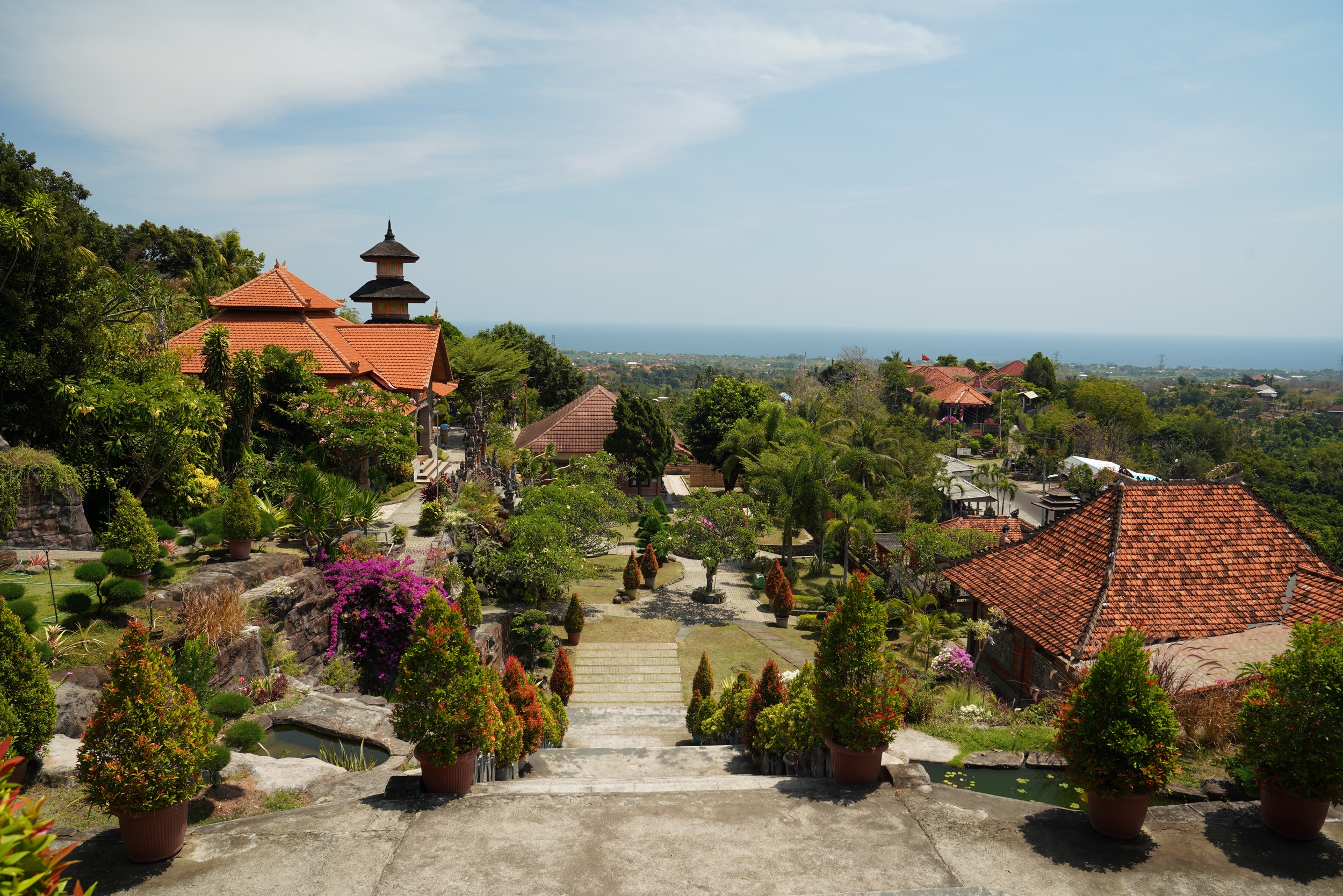 Auch wenn wir heute Morgen schon schwimmen waren führt uns der erste Stopp des Tages zu den Banja Hot Springs, die gar nicht so hot sind, eher angenehm, da heute jedoch der wärmste Tag unserer Rundreise war, reichte das auch. Als nächstes steht einer der wenigen buddhistischen Tempel auf der Agenda, der ist gar nicht so alt aber sehr schön mit seinem Garten und dem Blick aufs Meer gelegen ist.
